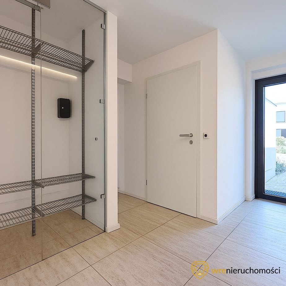 Bezpieczeństwo zapewniają drzwi antywłamaniowe oraz elektryczne rolety zewnętrzne.