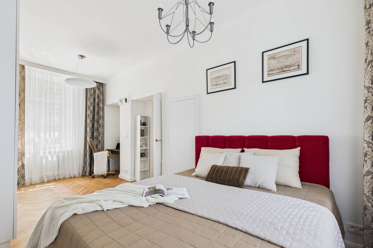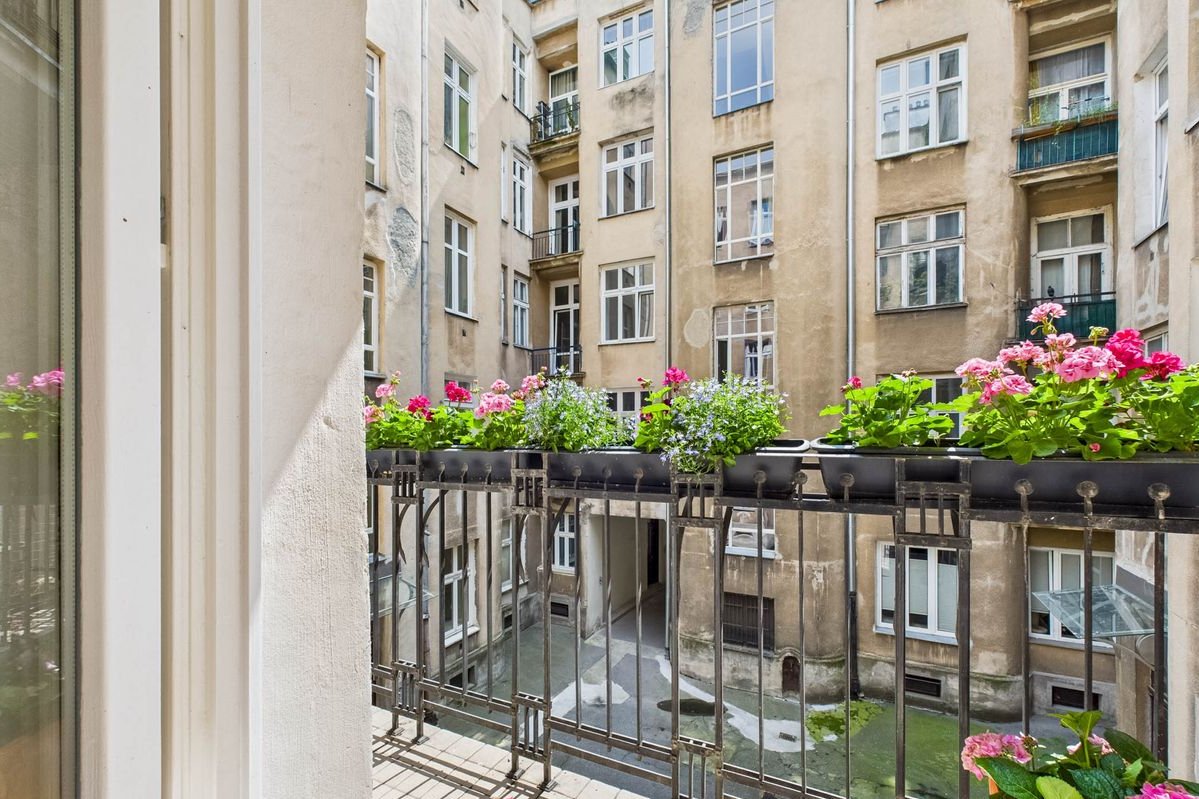Though in the heart of Warsaw — the apartment is remarkably quiet. The only sound from the bedroom and kitchen windows is birdsong.
