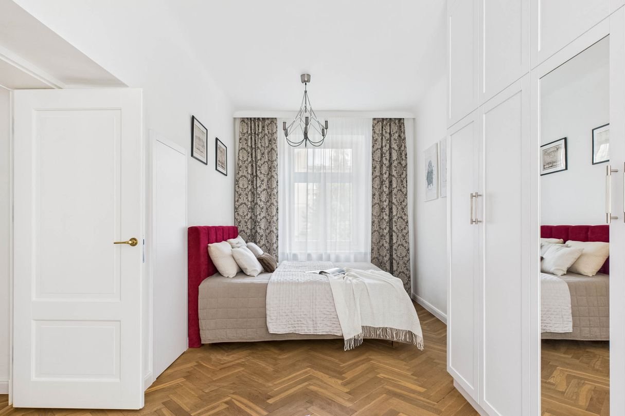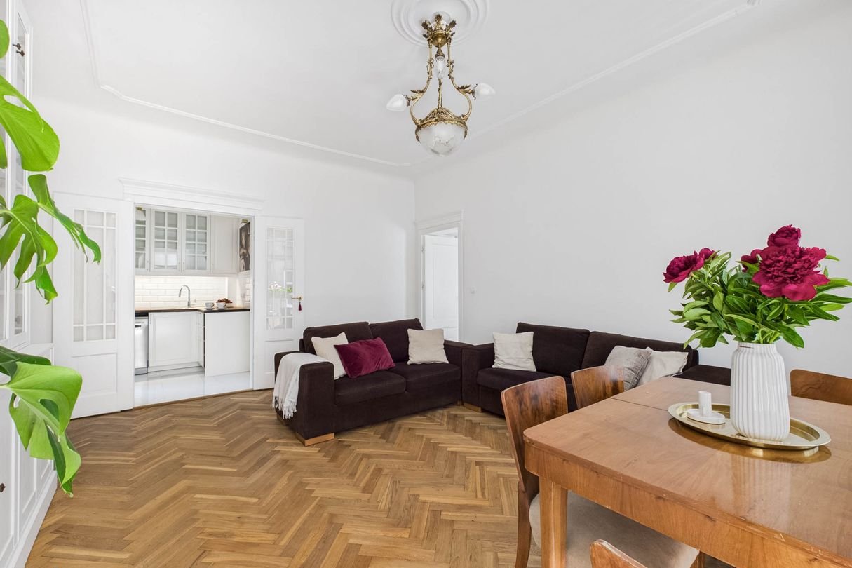 The living room and bedroom feature restored, oiled original pre-war parquet floors. The interior ambiance is highlighted by brand-new wooden window and door joinery, ceiling mouldings, and elegant brass handles.