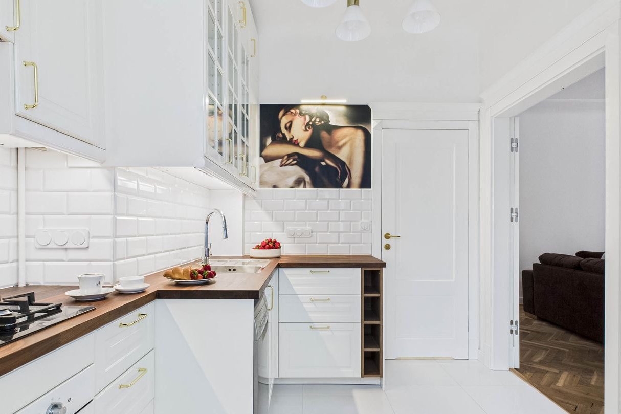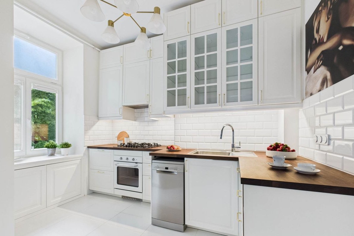 Kitchen with a window: custom cabinetry, gas stove, oven, dishwasher, and… a Tamara de Lempicka painting on the wall. The original built-in cold cupboard is still in place — perfect for homemade preserves.