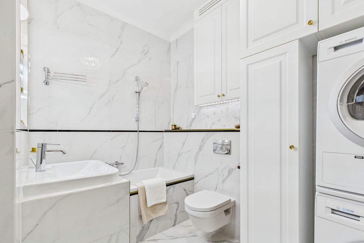 Bathroom with bathtub and toilet: Villeroy & Boch ceramics, Grohe fixtures, Bosch washer and dryer, stylish brass accents, and functional built-ins.