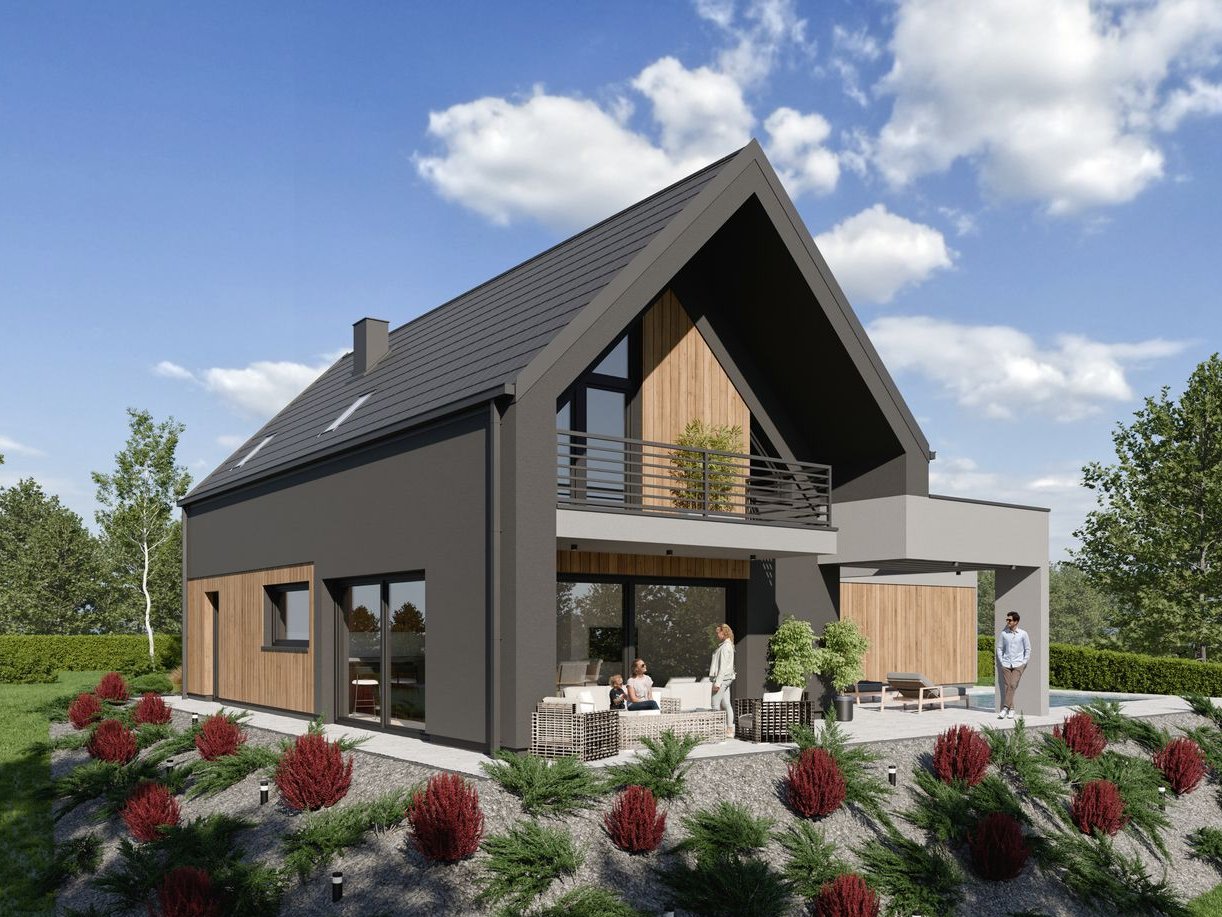 Nowoczesna, minimalistyczna forma budynku – prosta bryła, funkcjonalny rozkład, duże przeszklenia,