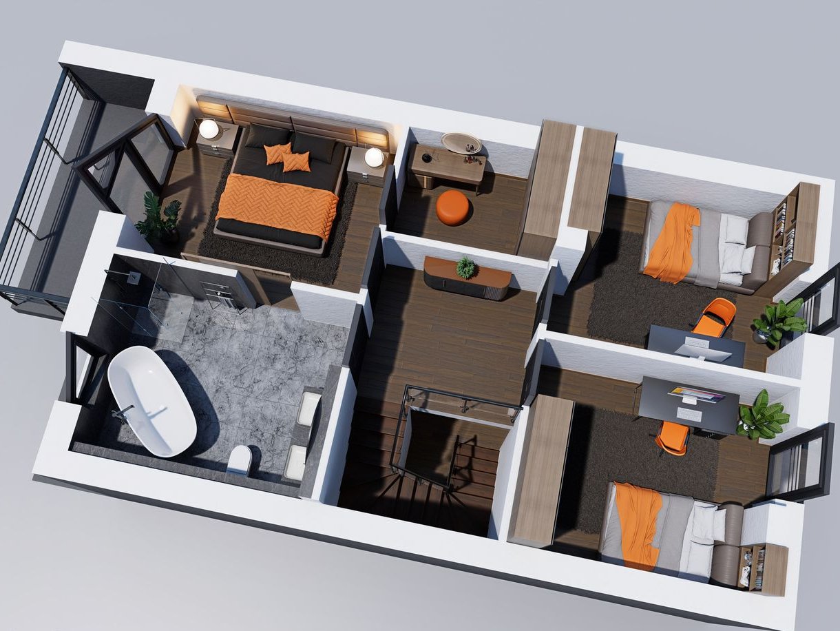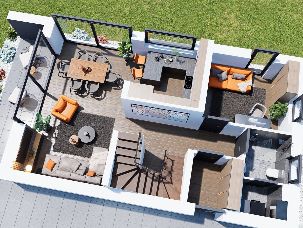 Standard domu: do indywidualnego wykończenia (projekt przewiduje nowoczesny układ z przestronną strefą dzienną, 3 sypialniami, gabinetem i funkcjonalnym zapleczem gospodarczym).