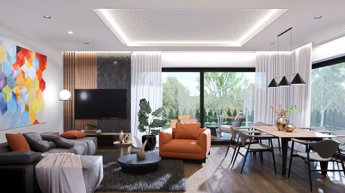 Przestronny salon z otwartą kuchnią i dużymi przeszkleniami