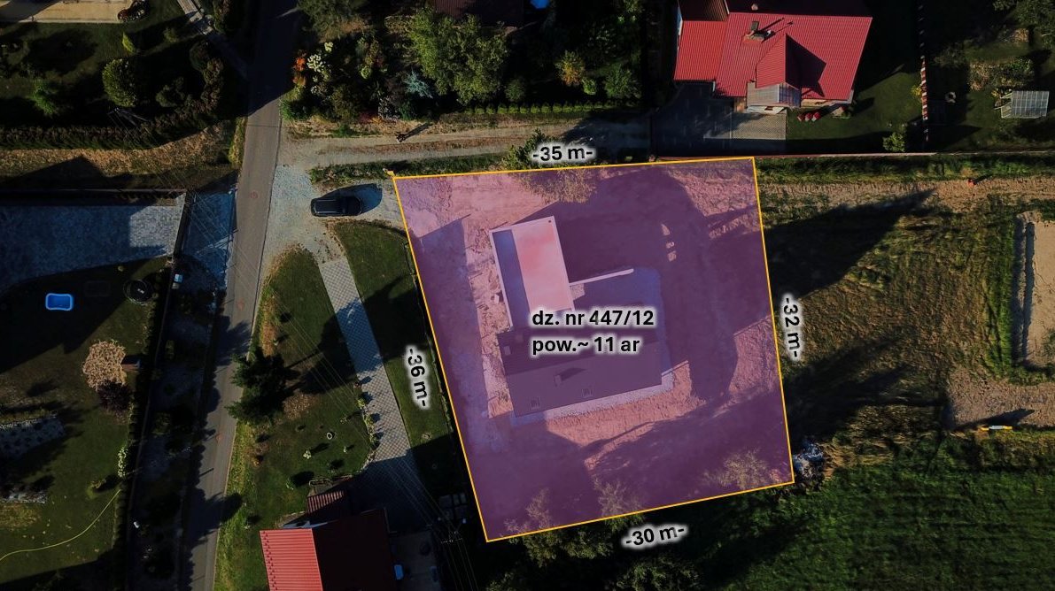 Działka: 1150 m² – płaska, obszerna, w pełni nasłoneczniona, z dużym potencjałem na ogród, plac zabaw lub basen.