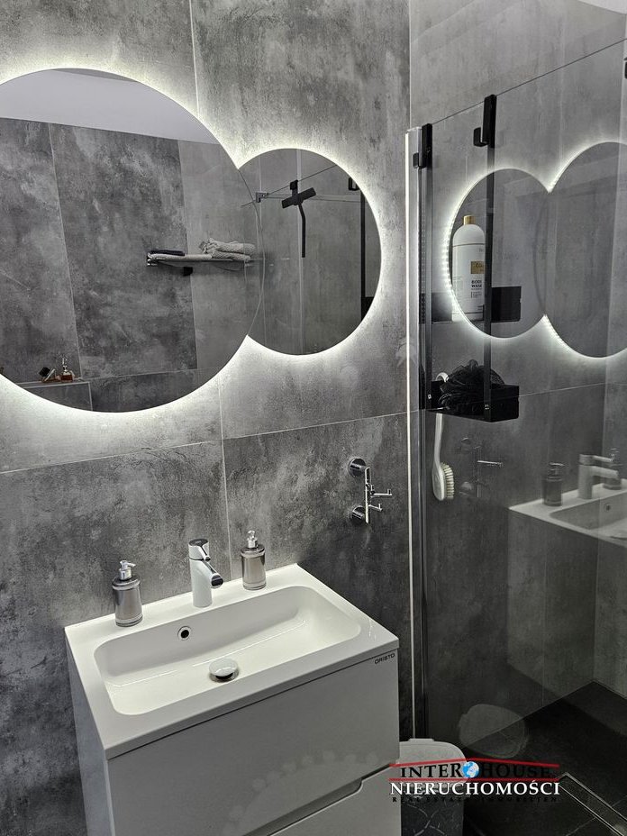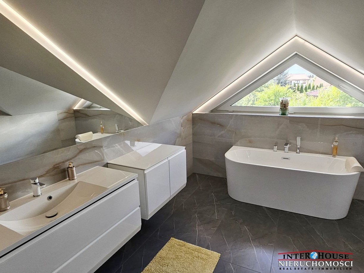 * łazienka: wanna wolnostojąca, umywalka, szafki łazienkowe, podwieszane wc z funkcją bidetu, kabina prysznicowa, zsyp na pranie