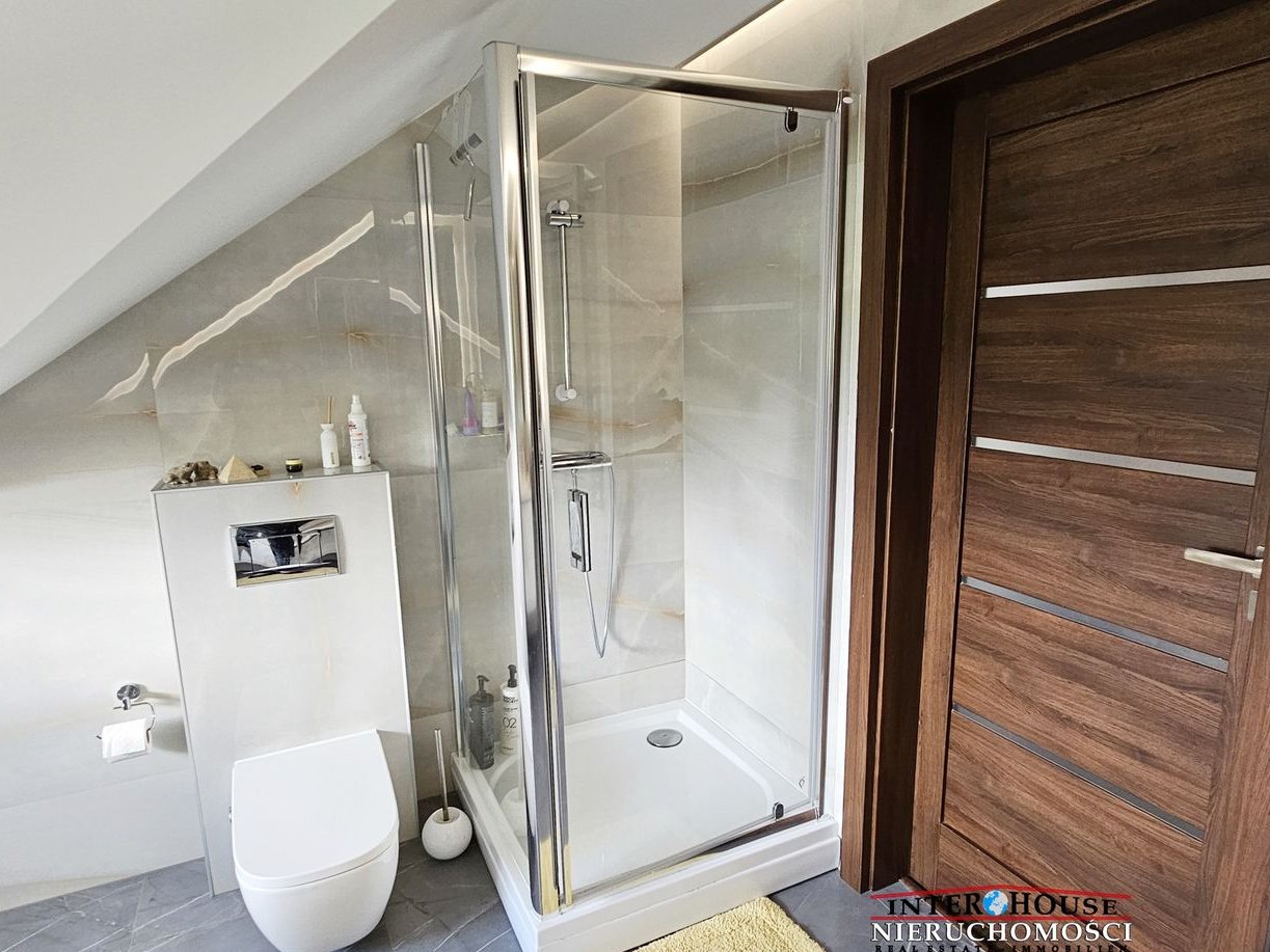 Dom docieplony, ogrzewanie i ciepła woda z 2-funkcyjnego pieca gazowego, dodatkowo podgrzewanie wody przez panele fotowoltaiczne. Na parterze w części mieszkalnej oraz w łazience na piętrze zostało rozprowadzone ogrzewanie podłogowe. Ceramiczna dachówka angobowana. Nieruchomość całkowicie ogrodzona: brama wjazdowa otwierana na pilota, ogrodzenie od frontu: panelowe, metalowe malowane proszkowo, pozostałe z siatki. Podjazd oraz komunikacja wyłożone zostały nowoczesnymi płytami.