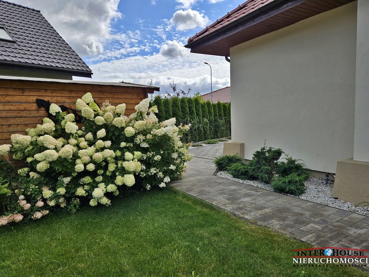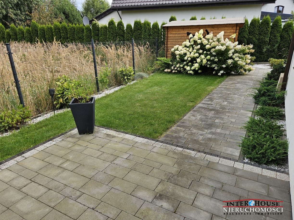 Pięknie zagospodarowany teren zewnętrzny oraz ogród z licznymi nasadzeniami, duży zadbany trawnik z automatycznym podlewaniem oraz automatycznym robotem koszącym Husqvarna. W ogrodzie duża altana do wykorzystania jako pomieszczenie gospodarcze.