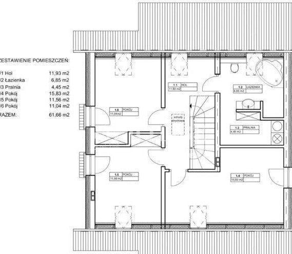 Budynek to dom klasyczny parterowy z użytkowym poddaszem, kuchnia, salon z jadalnią, łazienka , pomieszczenie techniczne, garaż , na piętrze 3 przestronne sypialnie , garderoba, pokój kąpielowy .