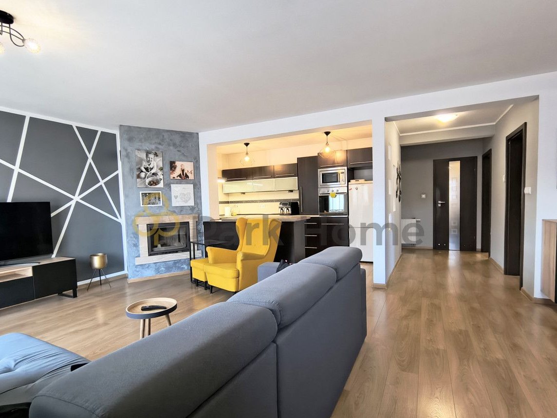 -przestronny, jasny salon z wyjściem na taras i kominkiem, który uprzyjemni chłodne wieczory