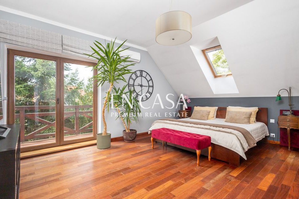 prowadzą eleganckie drewniane schody z kutą balustradą. Znajdują się tam dwie przestronne sypialnie, w tym główna sypialnia z klimatyzacją, dwoma balkonami i oknem dachowym, oraz druga sypialnia z wyjściem na balkon, łazienka z wanną z hydromasażem i jacuzzi oraz garderoba .