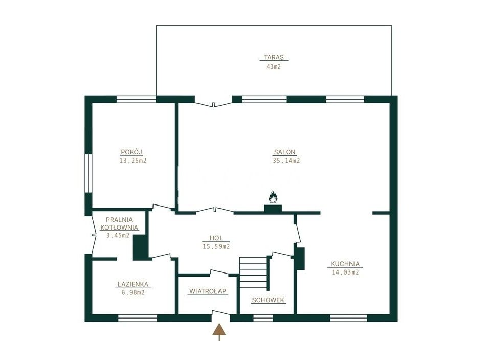 znajduje się przestronny salon z jadalnią , otwarta kuchnia , pokój gościnny/gabinet , łazienka oraz pralnia. Dodatkowo, pod schodami znajduje się praktyczna spiżarnia .