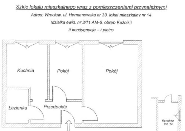 PKP S.A. Oddział Gospodarowania Nieruchomościami we Wrocławiu przedstawia propozycję sprzedaży w drodze przetargu nieograniczonego lokalu mieszkalnego nr 14 usytuowanego na I piętrze budynku mieszkalnego przy ul. Hermanowskiej 30 we Wrocławiu o powierzchni użytkowej 36,20 m2, na co składa się: