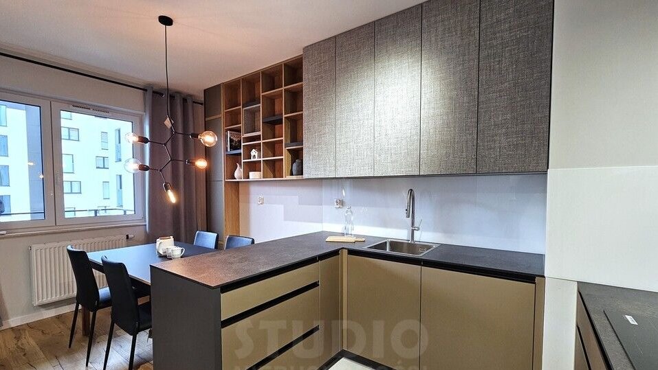 -- Część kuchenna z oknem, otwarta na salon, z doskonale zaprojektowaną, wysoka zabudowa meblowa z półwyspą - wykonaną na wymiar, wyposażoną w najwyższej klasy sprzęt AGD: lodówka, zmywarka, płyta indukcyjna, piekarnik, okap, zlewozmywak oraz stół jadalny z 4 krzesłami.