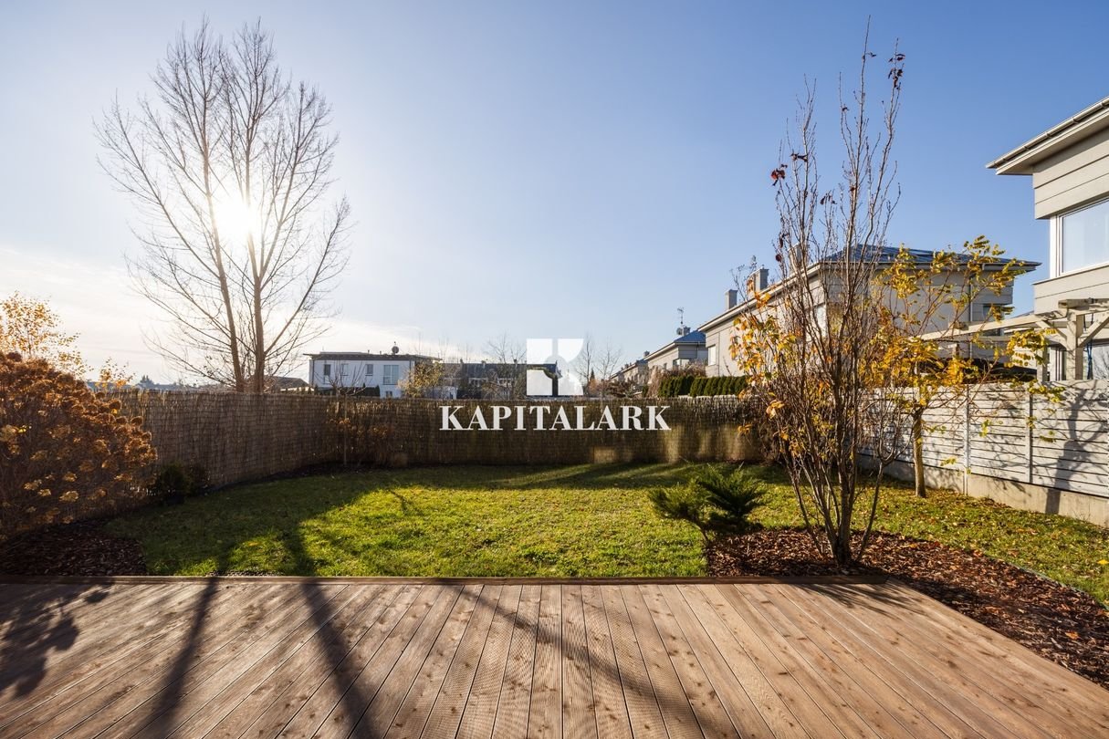 Dom położony jest w malowniczej, zielonej okolicy, a jednocześnie świetnie skomunikowanej z kluczowymi obszarami Warszawy. Lokalizacja zapewnia spokój, prywatność oraz idealne warunki do rekreacji, jednocześnie oferując łatwy dostęp do sklepów, szkół i komunikacji miejskiej. Dojazd do centrum Warszawy zajmuje ok. 22 minuty. W bliskiej odległości znajduje się przystanek autobusowy. W 15 minut samochodem można dotrzeć do parkingu P+R Młociny, skąd metrem łatwo dojechać do centrum miasta.