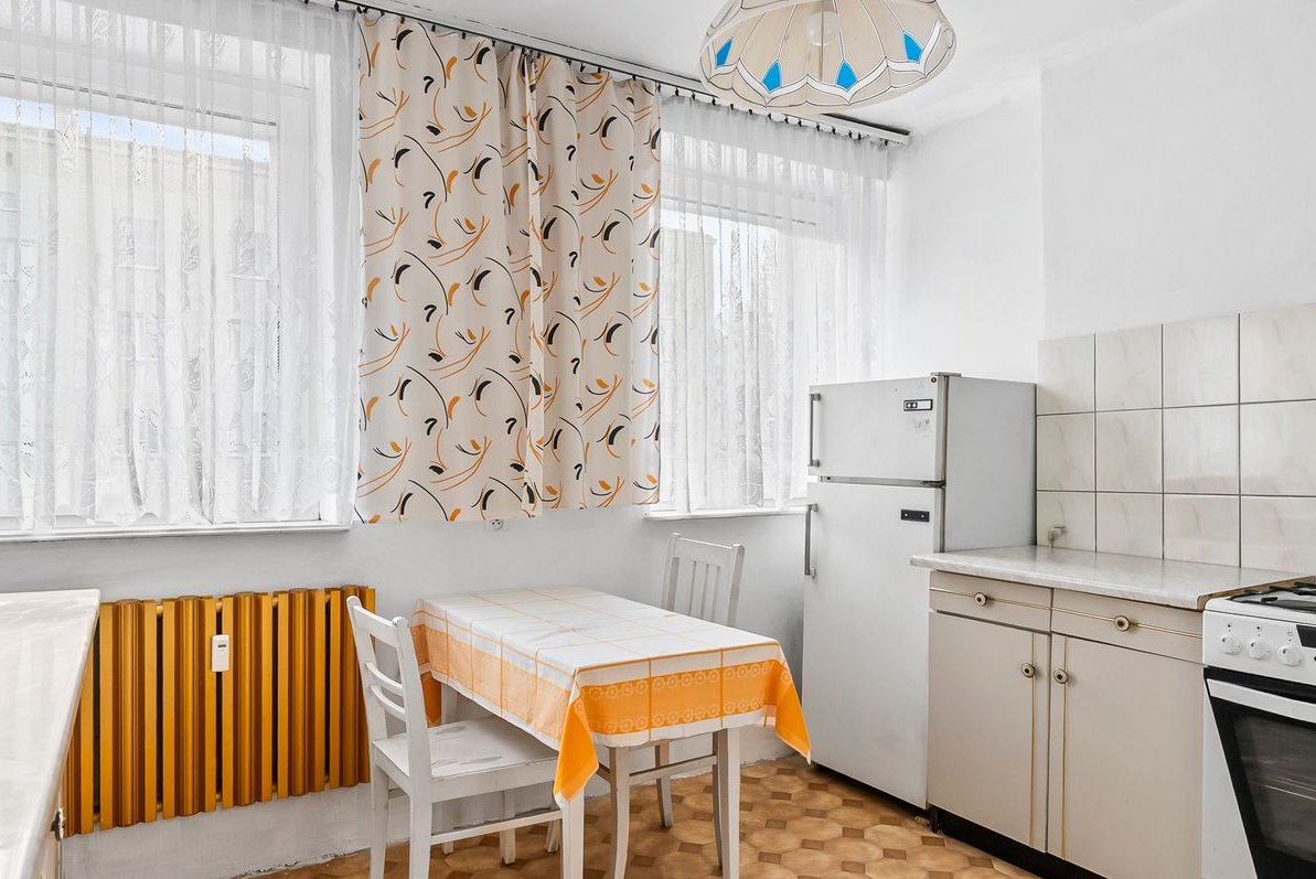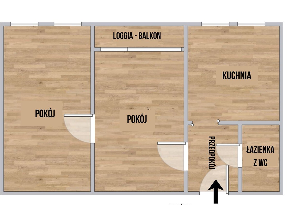Układ pomieszczeń: 2 pokoje (w tym jeden przechodni), jasna i duża kuchnia, łazienka z WC, przedpokój