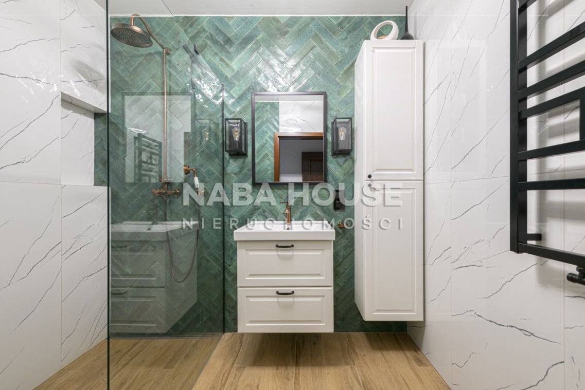 Na szczególna uwagę zasługuje obszerna, wygodna sypialnia, z dużą ilością przestrzeni do przechowywania - prywatna, wyciszona znajdująca się w nieco odległej części mieszkania. Obok sypialni łazienka z prysznicem, z miedzianymi wykończeniami armatury, która przepięknie harmonizuje z głęboka zielenią glazury ściennej.