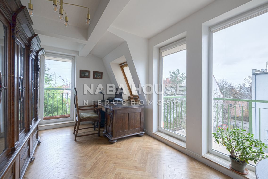 Jasny i przytulny pokój dzienny z wyjściem na balkon, świetny do odpoczynku, rozmów i długich wieczorów. Gabinet daje przestrzeń do pracy lub twórczych zajęć, stąd również można wyjść na balkon by zaczerpnąć świeżego powietrza w czasie przerwy od pracy i spojrzeć na szerokie widoki sopockich dachów.