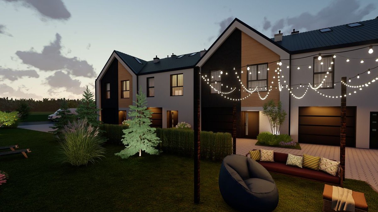 Powstają tu przestronne, świetnie zaprojektowane domy o powierzchni 134,77 m² i 139,62 m2, z dużymi przeszkleniami i pięknym ogrodem skierowanym na południe — słońce będzie tu Twoim codziennym gościem!