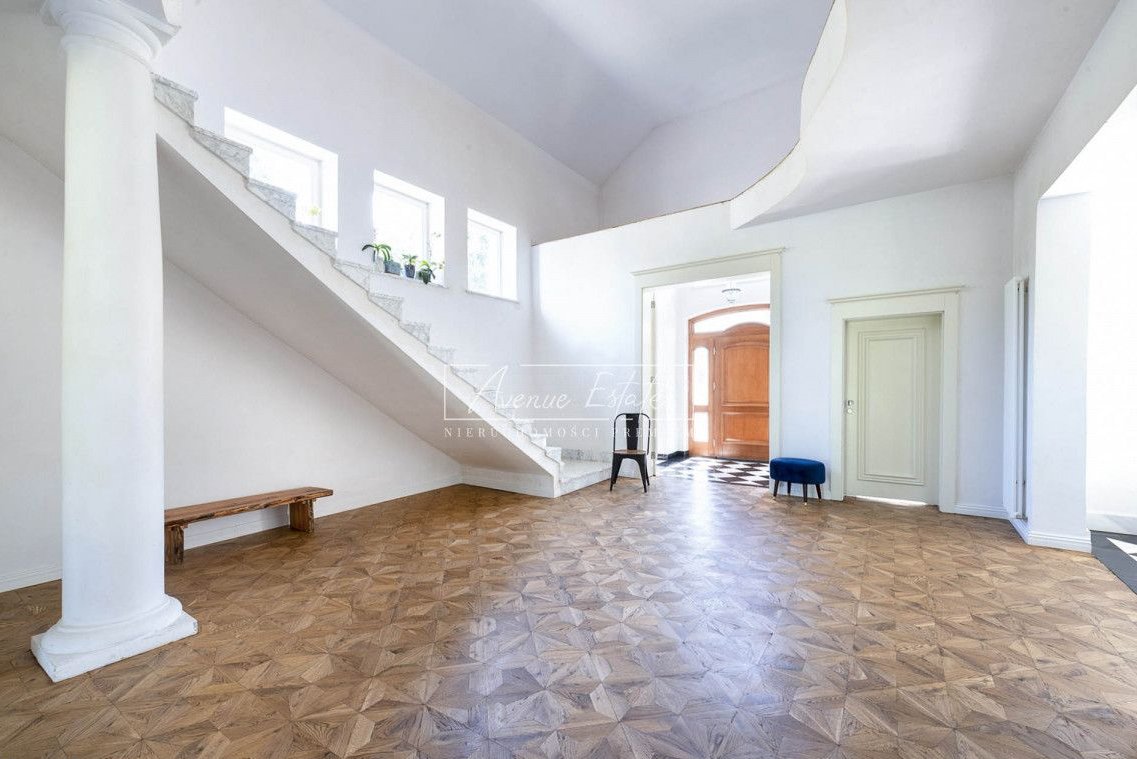 Dom posiada 5 sypialni w tym dwie reprezentacyjne o powierzchni powyżej 40m2 każda, pokój kąpielowy /27 m2/ z natryskiem /6m2/, łazienkę, przestronną jasną kuchnię połączona z jadalnią /42m2/, praktyczną spiżarnię, antresolę nad reprezentacyjnym holem głównym. Z otwartej przestrzeni holu, przechodzimy do przestronnego salonu/ 60 m2/ z wyjściem na zielony ogród. Na ostatnim piętrze - klimatyczne i stylowe, świetnie doświetlone poddasze z oknami połaciowymi.