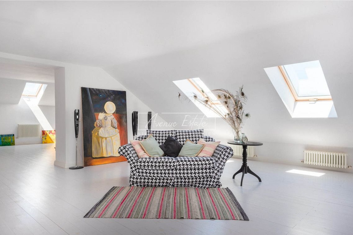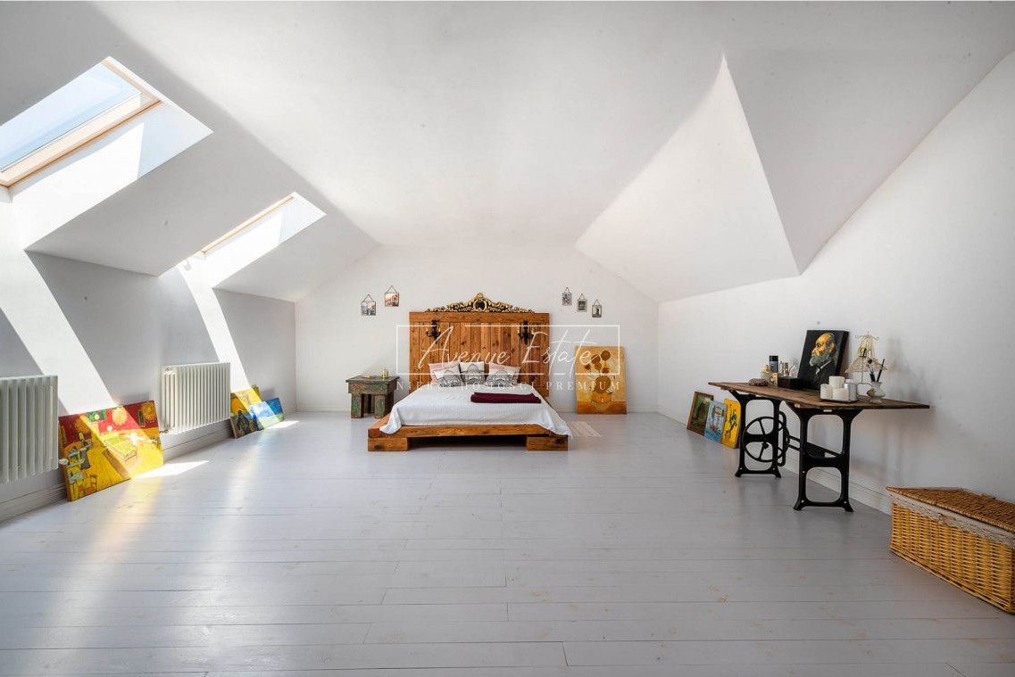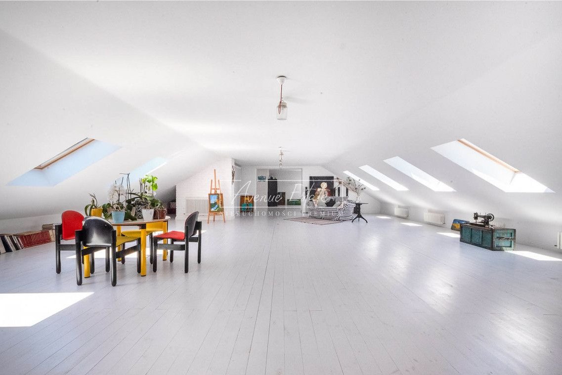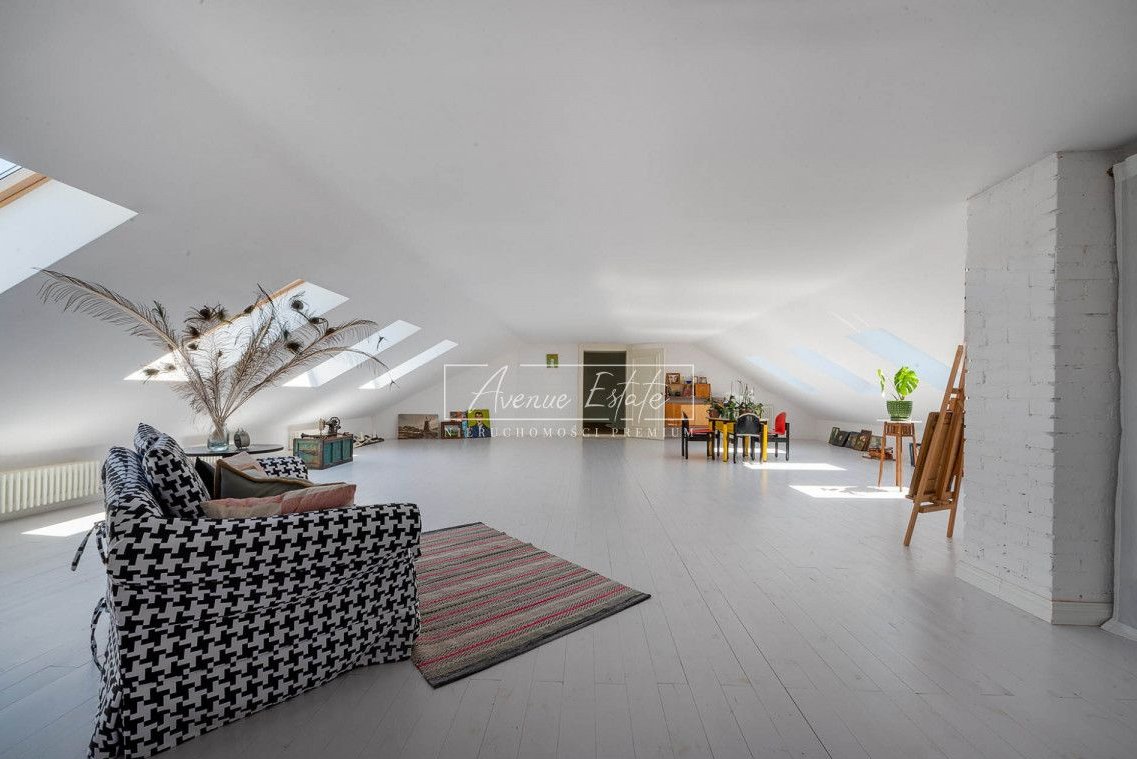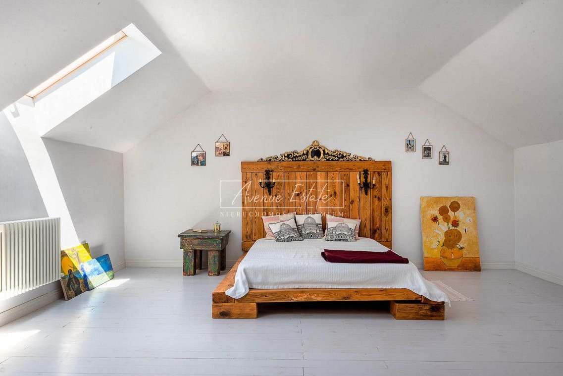 The house has 5 bedrooms, including two representative ones with an area of over 40 m2 each, a bathing room /27 m2/ with a shower /6 m2/, a bathroom, a spacious bright kitchen combined with a dining room /42 m2/, a practical pantry, a mezzanine above the representative main hall. From the open space of the hall, we go to a spacious living room / 60 m2 / with access to the green garden. On the top floor - a climatic and stylish, well-lit attic with roof windows.