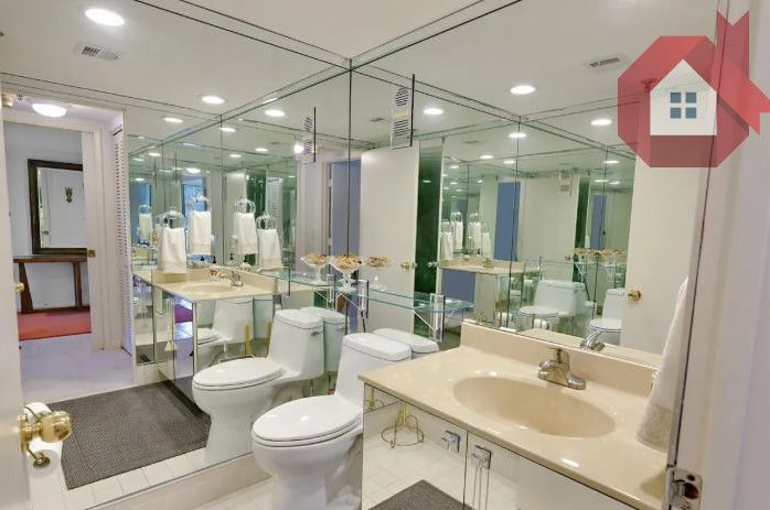 The private area includes three comfortable bedrooms. The primary bedroom features two walk-in closets and an elegant spa-style bathroom with a bathtub and a spacious shower. One of the additional bedrooms has its own en-suite bathroom, making it ideal for guests.