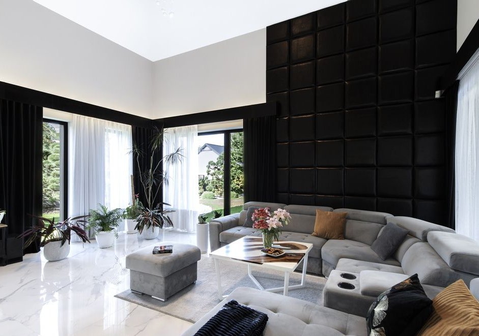 Reprezentacyjny salon z kominkiem i imponującą wysokością sufitu (ok. 5 m), połączony z otwartą kuchnią oraz jadalnią.