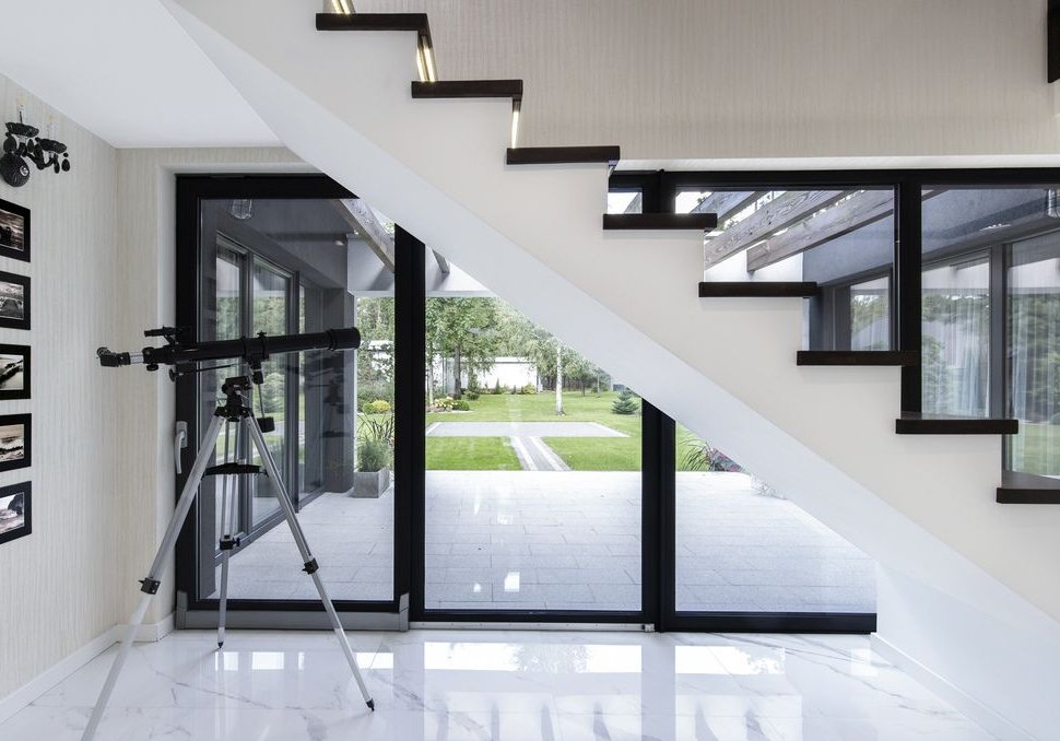 Wyjście na duży, słoneczny taras z widokiem na ogród.