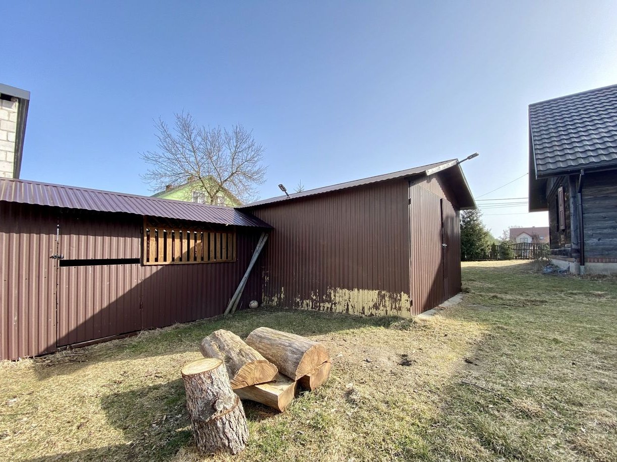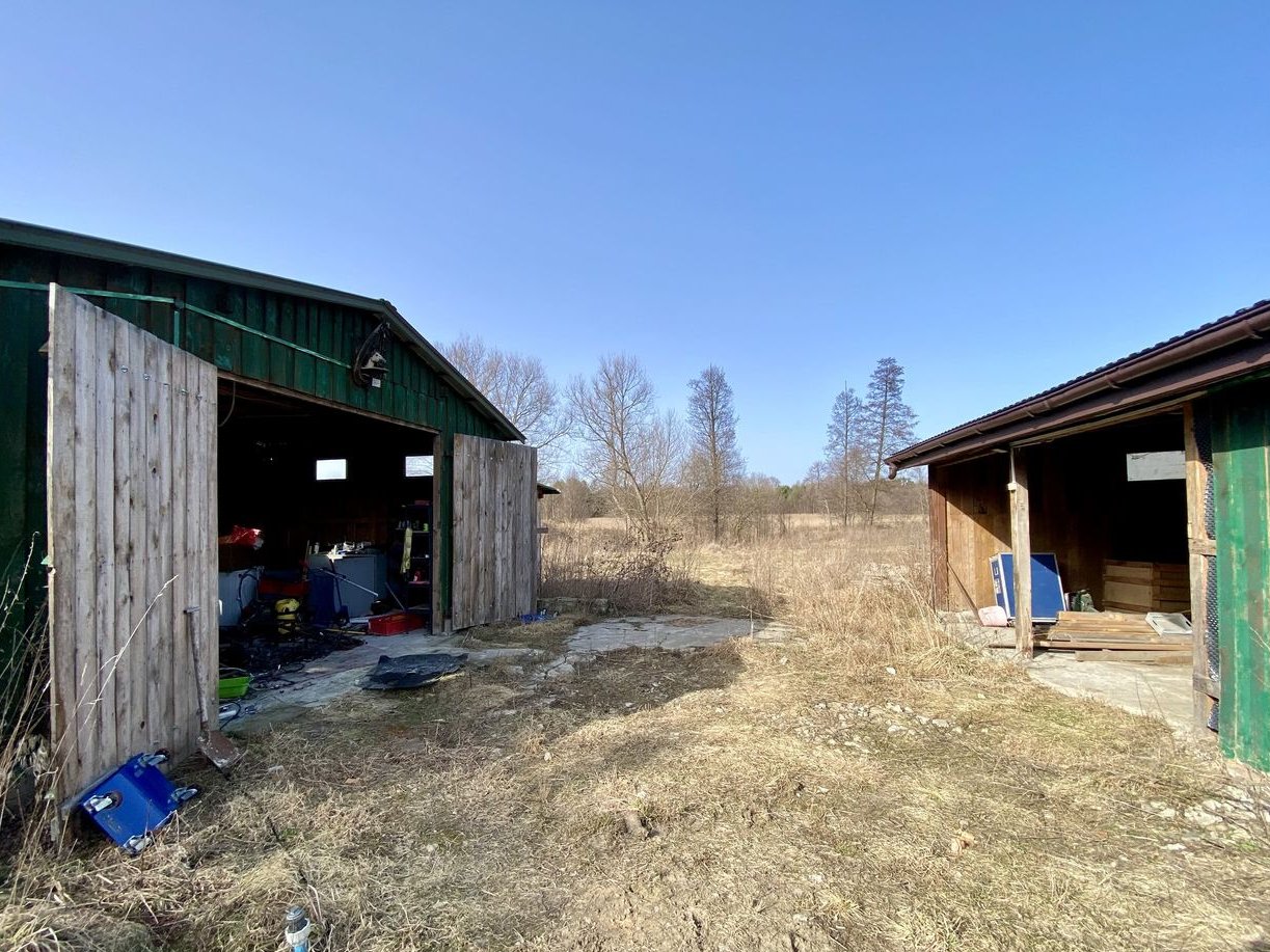 Duża, przestronna działka o powierzchni 5548 m², z naturalnym oczkiem wodnym. Na niej trzy solidne budynki gospodarcze (np. na sprzęt, warsztat czy przechowywanie) oraz dom.