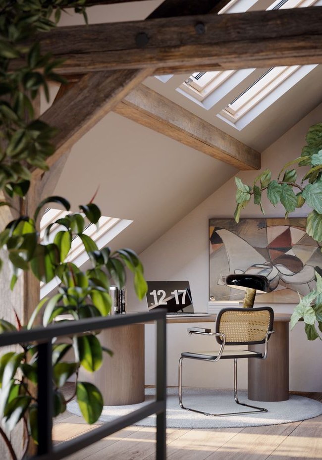 Duże, drewniane okna oraz wysokość 4,85 zapewniają doskonałe doświetlenie pomieszczeń oraz elegancki klimat wnętrza.