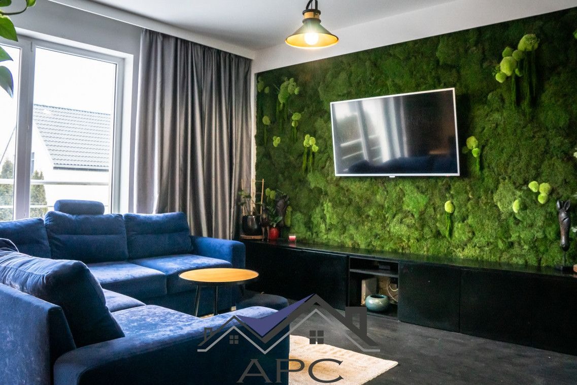 Pełne, efektowne przeszklenia zapewniają doskonałe doświetlenie wnętrza przez cały dzień. Centralnym elementem salonu jest ściana z żywego mchu — designerski detal, który podnosi reprezentacyjność wnętrza i nadaje mu wyjątkowy charakter.
