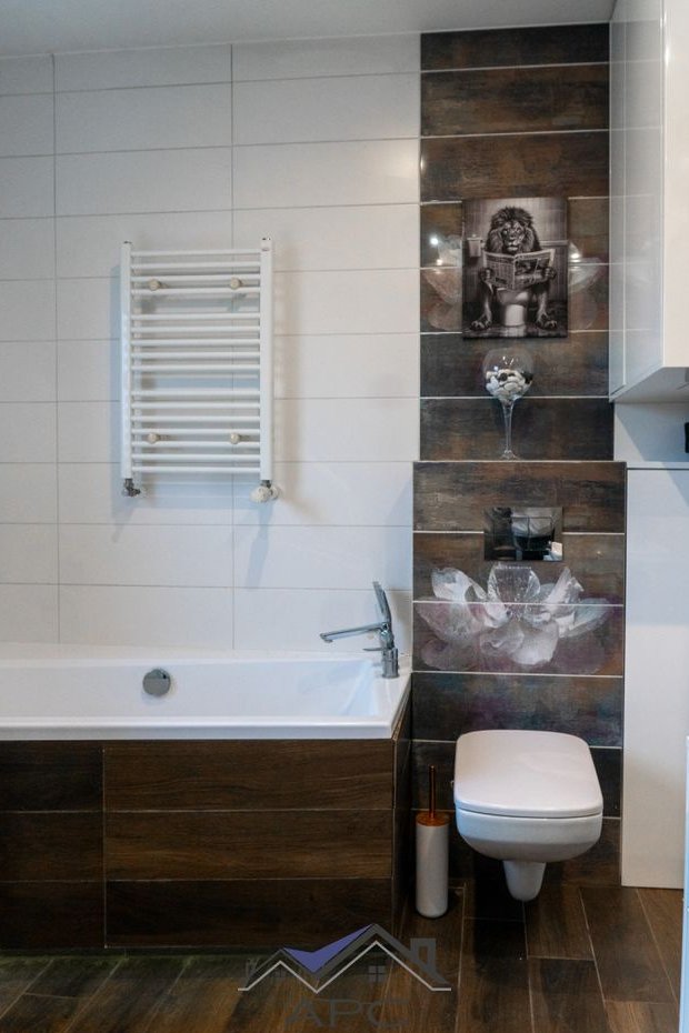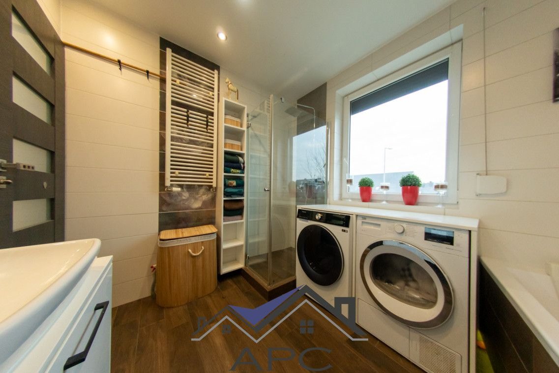 • przestronna łazienka wyposażona w wannę i prysznic, zabudowana toaleta GEBERIT, miejsce na pralkę i suszarkę.