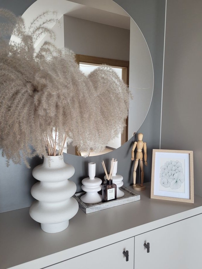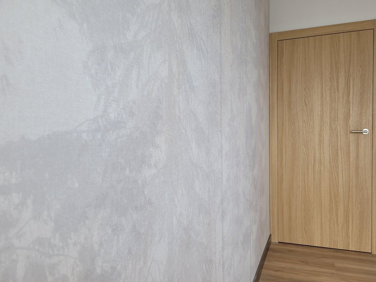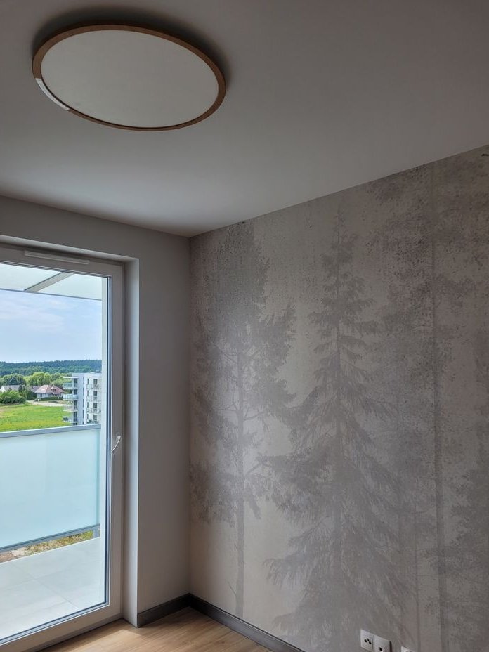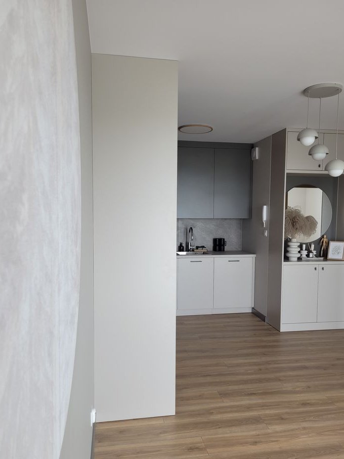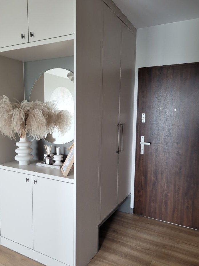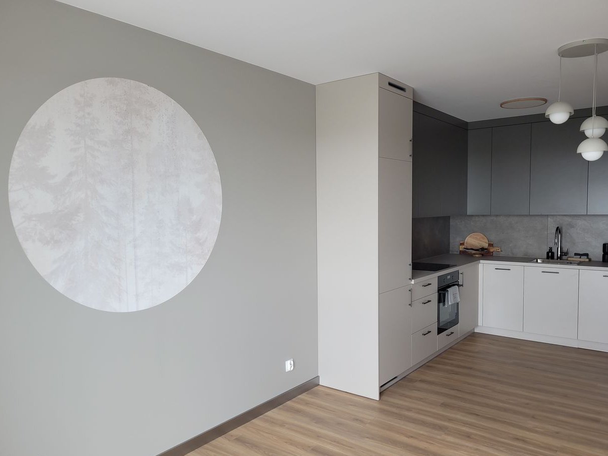 Wnętrze mieszkania jest spójne stylistycznie i kolorystycznie- wykorzystuje kolory ziemi, szarości i odcienie beżu. Całość łączy podłoga i drzwi w odcieniach ciepłego drewna. Wyjątkową ozdobą sypialni i salonu jest niebanalna tapeta z motywem lasu. Całość podkreślona jest nastrojowym oświetleniem.