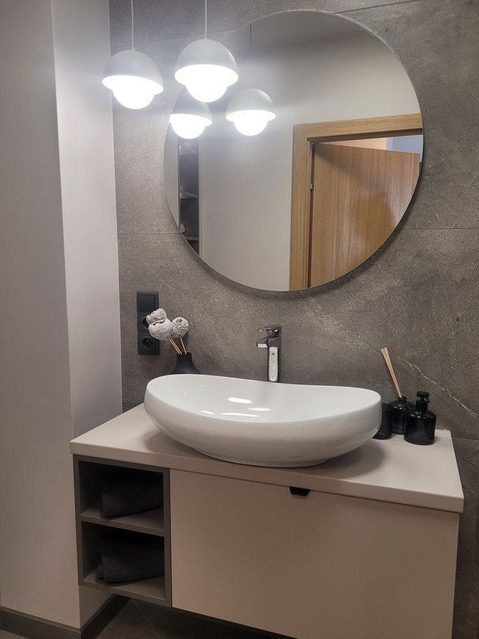 Podobnie jak w innych pomieszczenia, również w łazience znajdziemy szarości i beże. Dla wygody użytkowania, łazienka została wyposażona w kabinę prysznicową. Nie zapomniano o miejscu do przechowywania. W łazience oraz korytarzu przewidziano pojemne szafy, które pomieszczą rzeczy, których nie warto eksponować.