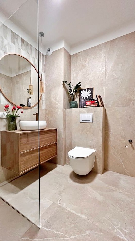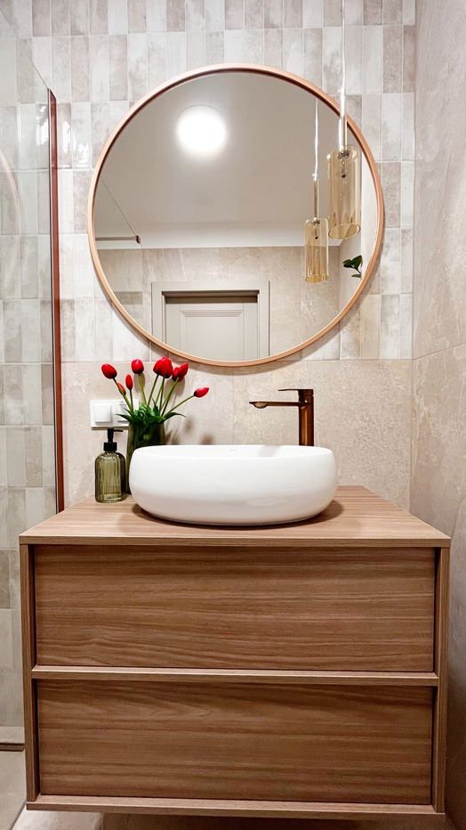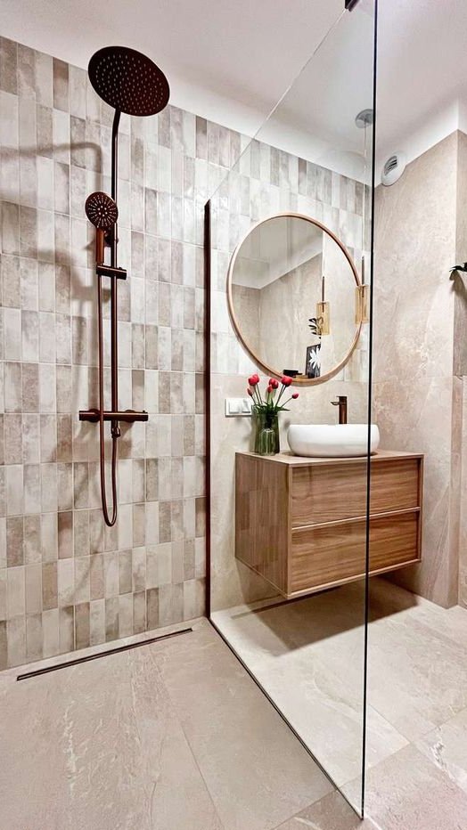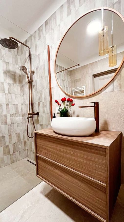 nowoczesna łazienka, z miedzianą armaturą i dużą kabiną walk-in,