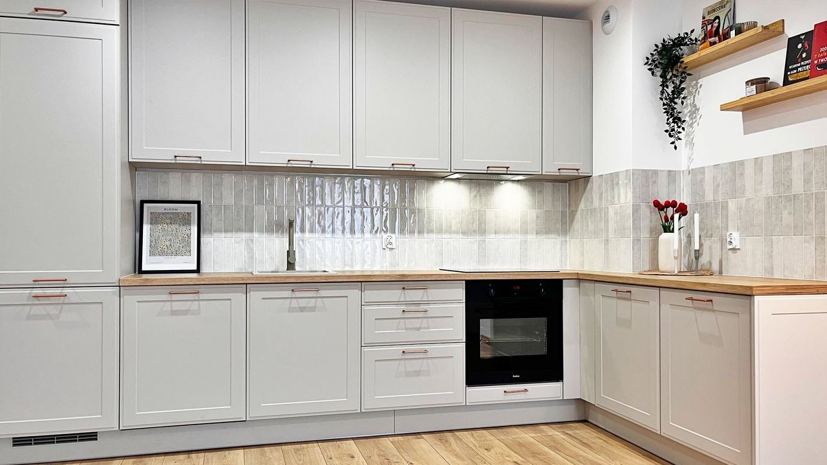 przestronny salon z aneksem kuchennym – kuchnia w zabudowie w ciepłych odcieniach beżu, z drewnianym blatem, w pełni wyposażona: lodówka z zamrażarką, płyta indukcyjna, piekarnik, zmywarka, okap; z salonu wyjście na słoneczny taras,