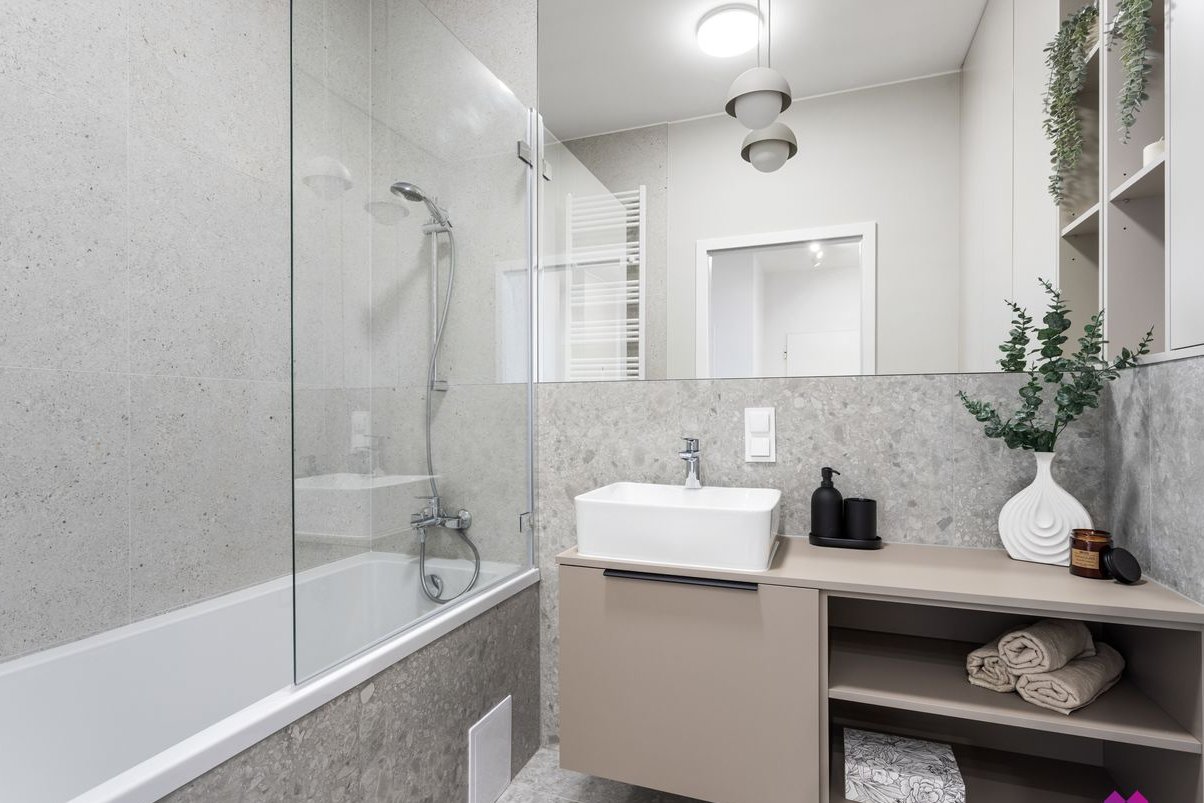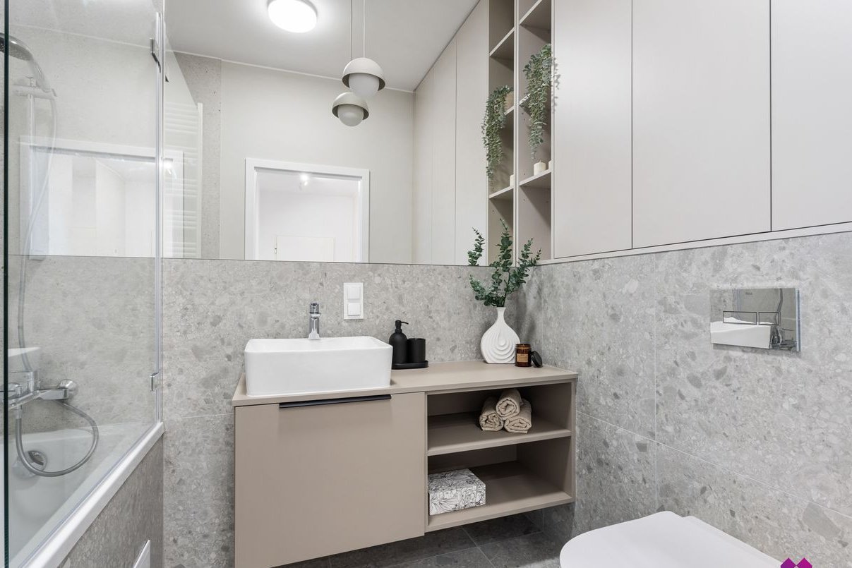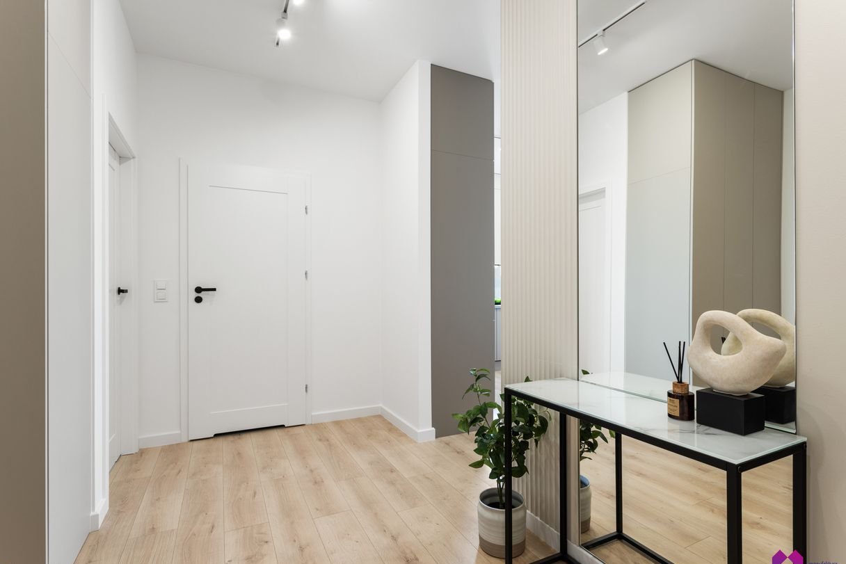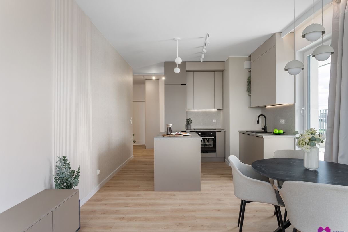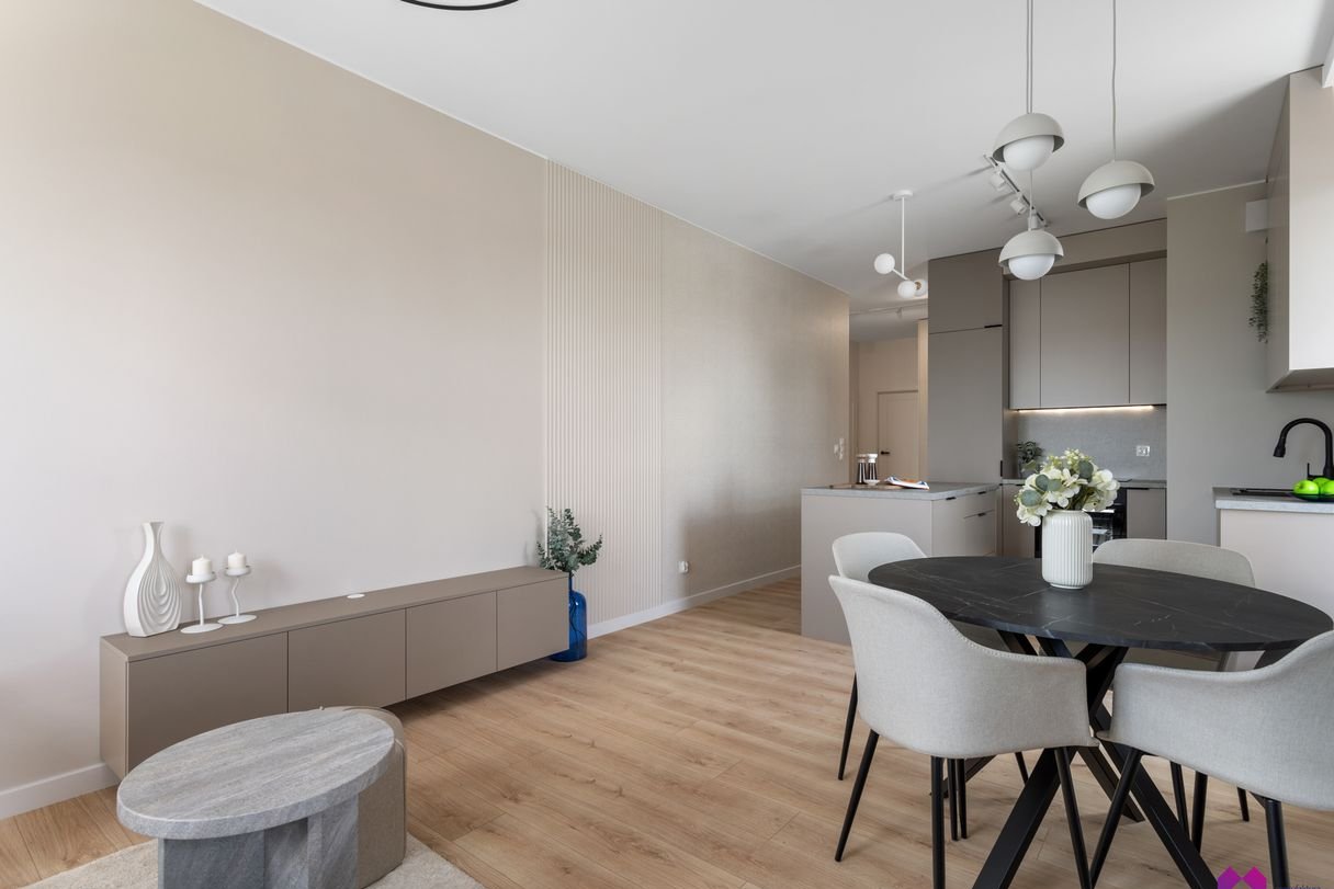 Mieszkanie wykończone pod klucz w podwyższonym standardzie w stylu nowoczesnym według najnowszych trendów. We wnętrzu panują odcienie beżu, drewna, brązu oraz grafitu co sprawia, że mieszkanie jest niezwykle eleganckie ale również przytulne.
