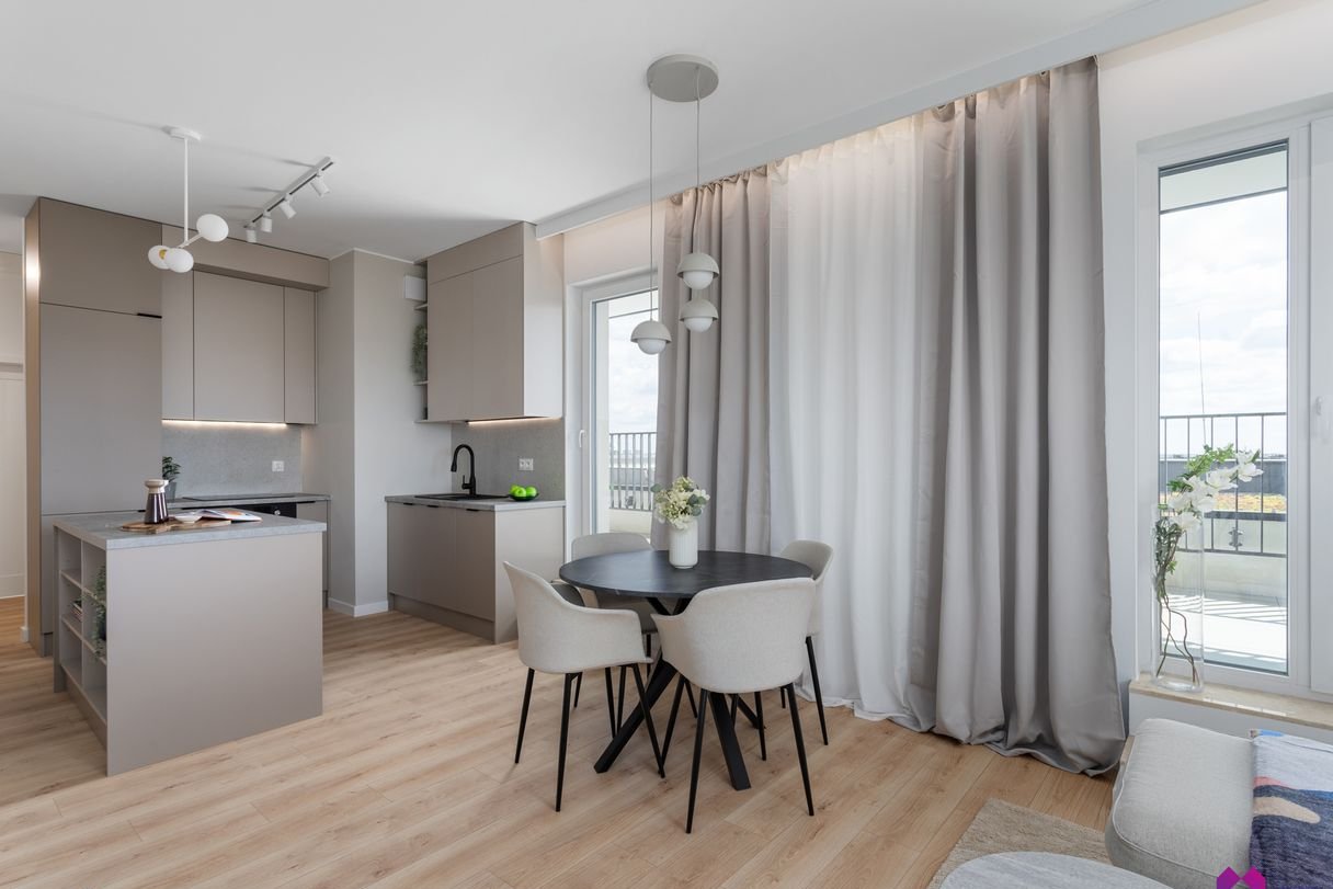 Przestronny i słoneczny salon z aneksem kuchennym został zaprojektowany z funkcjonalnym podziałem na strefy: wypoczynkową z wygodną kanapą oraz miejscem na telewizor, odpowiednio wydzieloną strefą jadalnianą oraz aneksu kuchennego. Z salonu można również wyjść na duży taras z widokiem na panoramę Poznania.