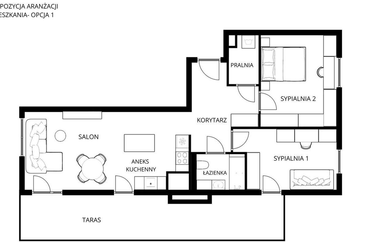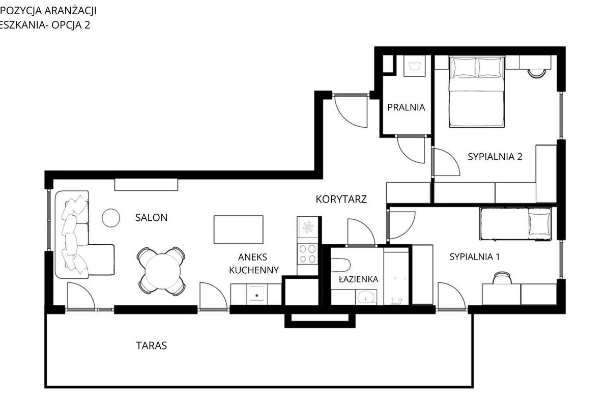 Dwie funkcjonalne i ustawne sypialnie, które można zaaranżować wedle własnych potrzeb. Pomieszczenia doświetlone ogromną ilością światła dzięki dużym oknom. Z mniejszej sypialni jest drugie wyjście na taras.