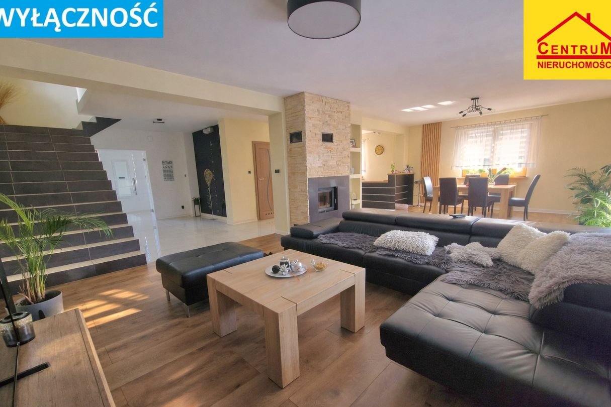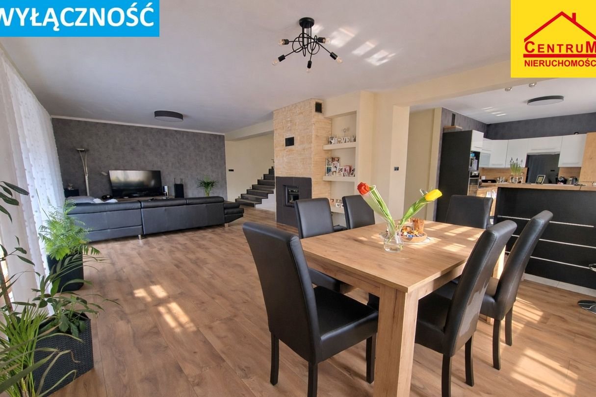 - przestronny salon z kominkiem płynnie połączony z jadalnią i dużą kuchnią, z salonu wyjście na taras z zejściem do ogrodu