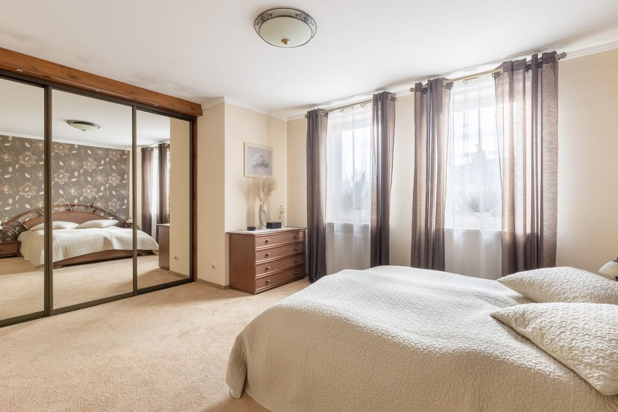Główna sypialnia z garderobą oraz wejściem do prywatnej łazienki