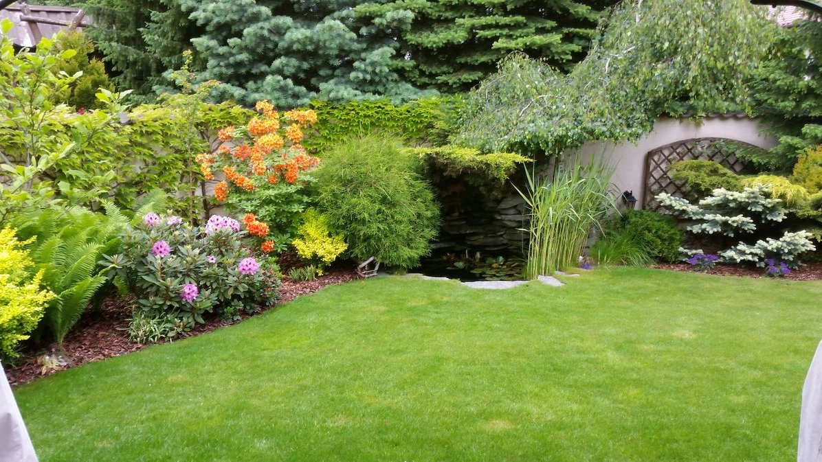 Pięknie zagospodarowana działka z licznymi nasadzeniami krzewów i drzew, ozdobnym oczkiem wodnym oraz efektownym oświetleniem ogrodowym.