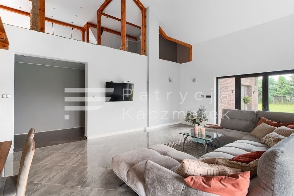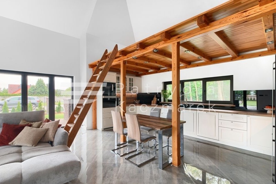 Dom ma nowoczesną bryłę. Wysokie sufity w salonie oraz na całości antresola, na której wyodrębniono przestrzeń dla dzieci. Aktualnie na przestrzeń na antresoli prowadzi wygodna drabina, ale jest przygotowane miejsce na standardowe schody.