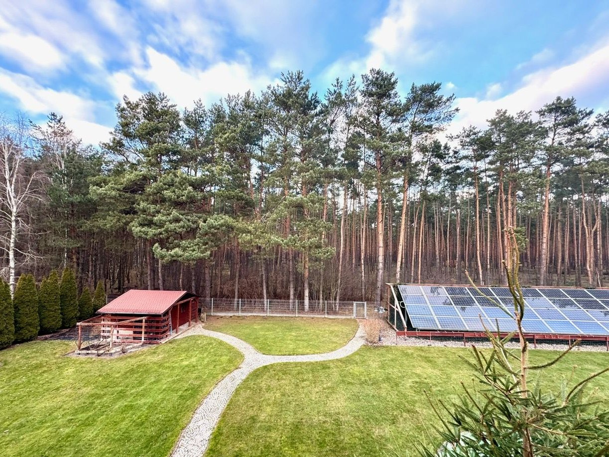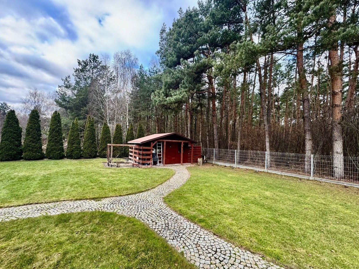 Posesja ma 3112 m² i jest w całości ogrodzona. Ogrodzenie z kamiennymi słupkami i drewnianymi przęsłami prezentuje się solidnie i elegancko. Działka jest zadbana i zagospodarowana (trawnik, nasadzenia), a sąsiedztwo lasu zapewnia prywatność oraz świetne warunki do spacerów i aktywności na świeżym powietrzu. Na terenie znajduje się domek gospodarczy, kompostownik oraz instalacja fotowoltaiczna.