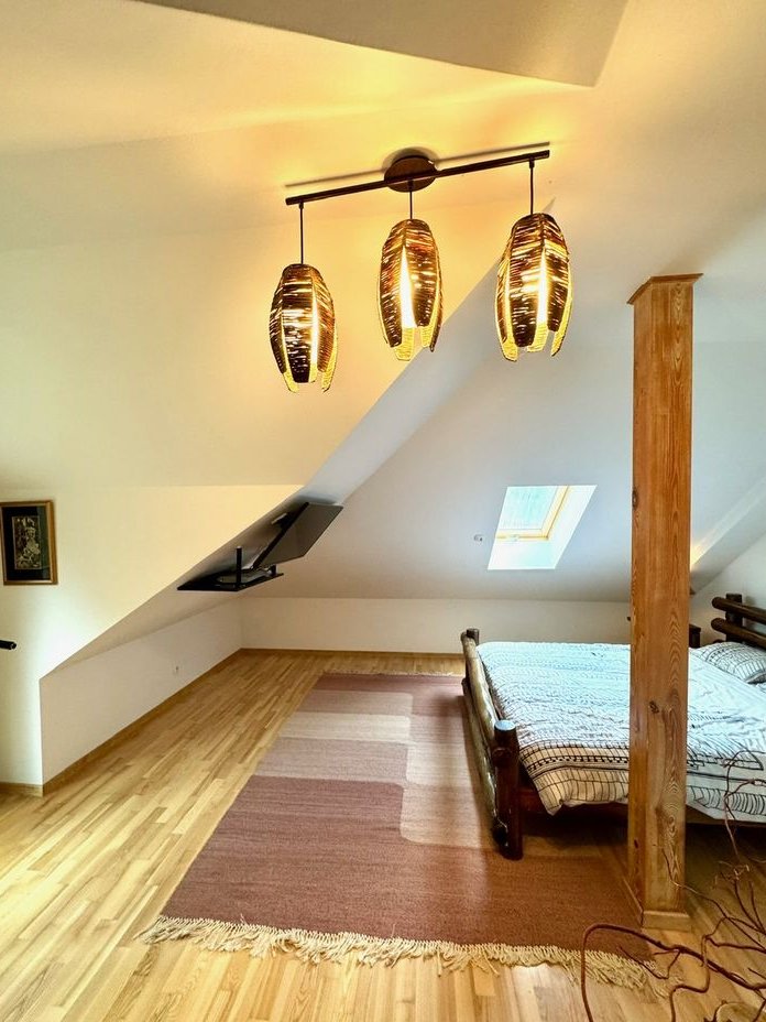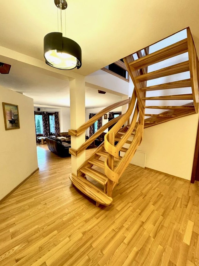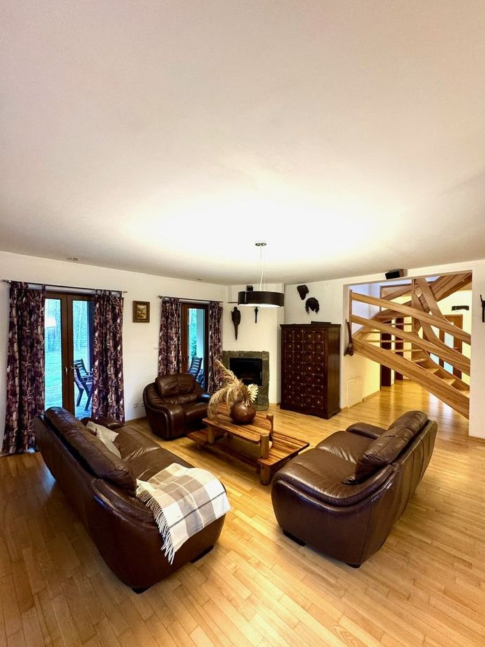 Dom jest urządzony w ciepłym, eleganckim stylu. Naturalne drewno (m.in. podłogi i schody) łączy się tu z kolonialnymi meblami i dodatkami, które budują wyjątkowo ciepłą atmosferę – masywne drewniane formy, dekoracje i detale nadają wnętrzom "duszę", a jednocześnie świetnie pasują do leśnego otoczenia nieruchomości.