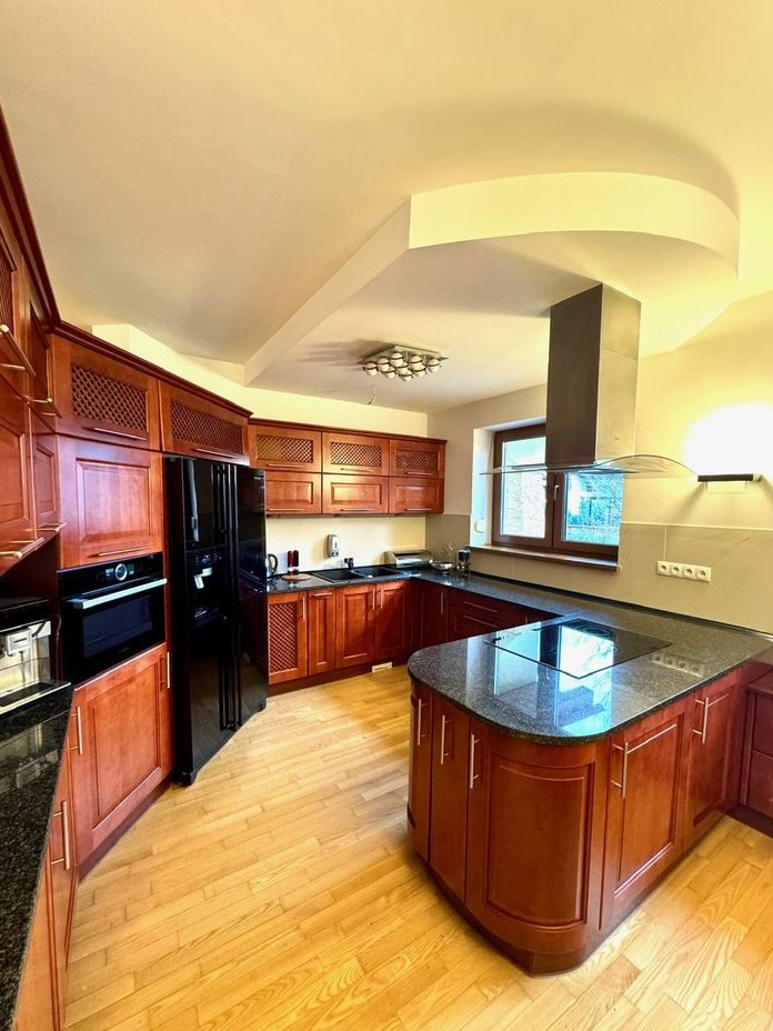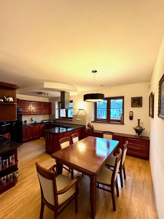 Kuchnia 19,82 m² – solidna drewniana zabudowa, kamienny blat i wygodna wyspa; kuchnia i jadalnia tworzą bardzo funkcjonalną przestrzeń.