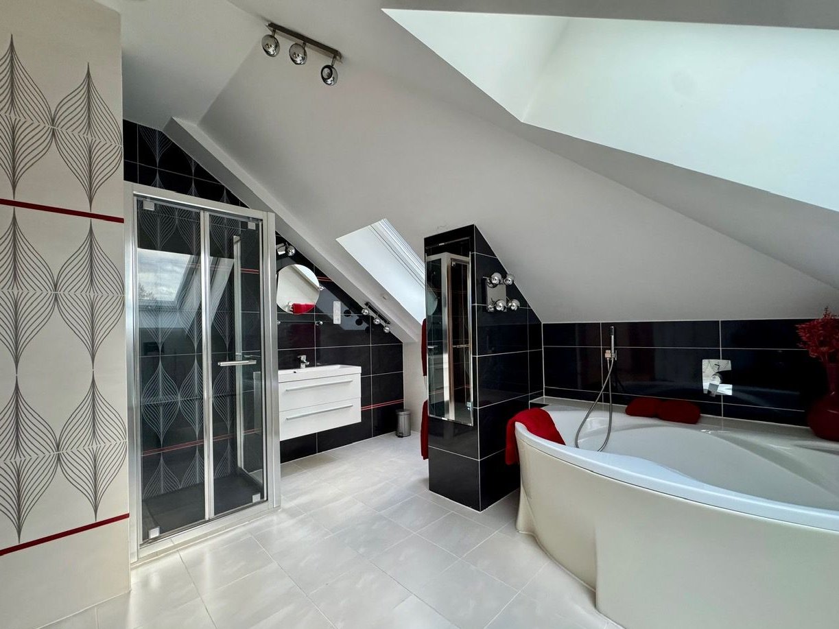 Poddasze: duża łazienka w układzie komfortowym (wanna + prysznic).
