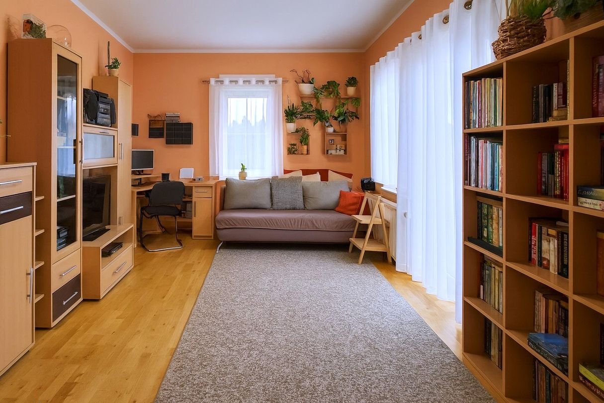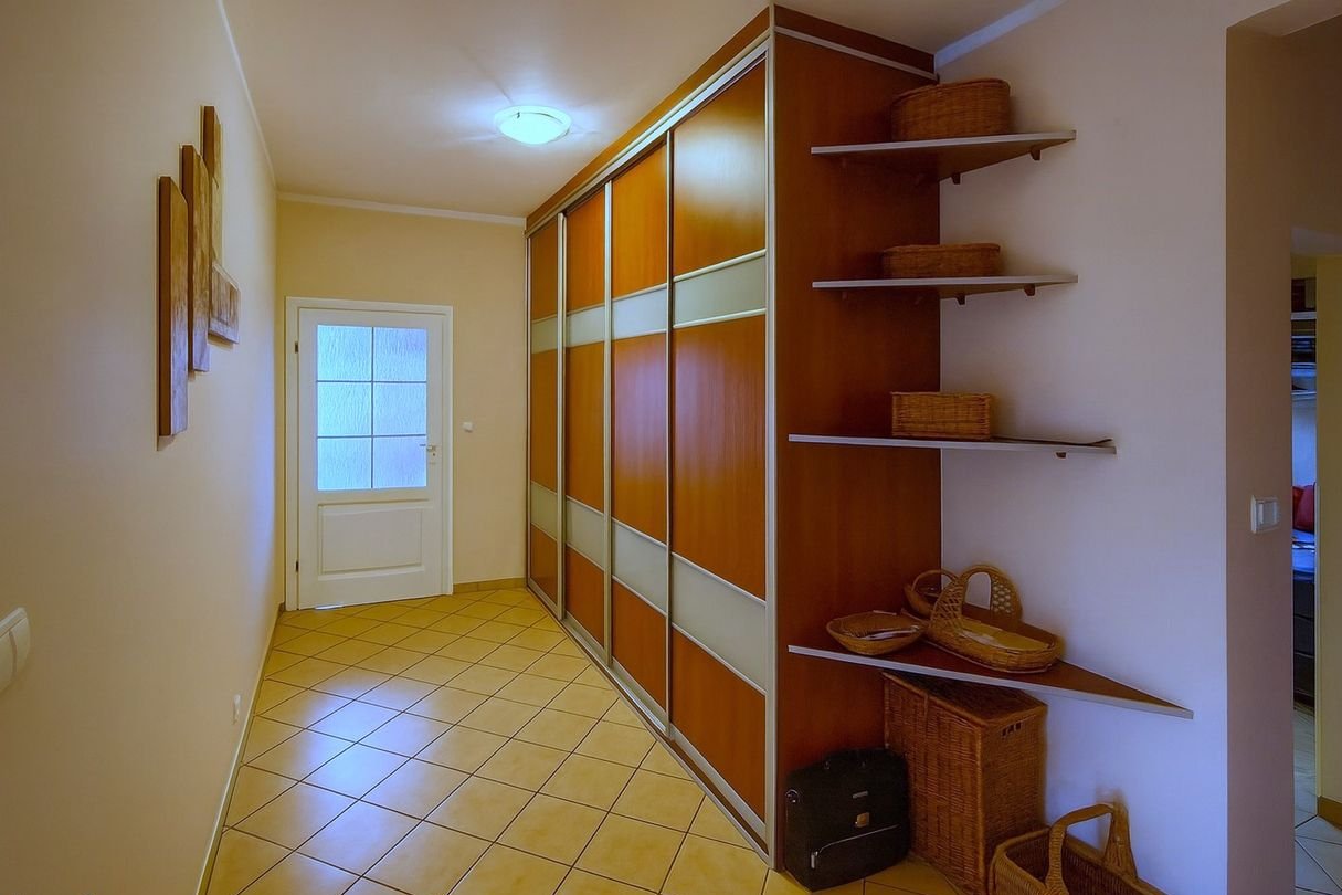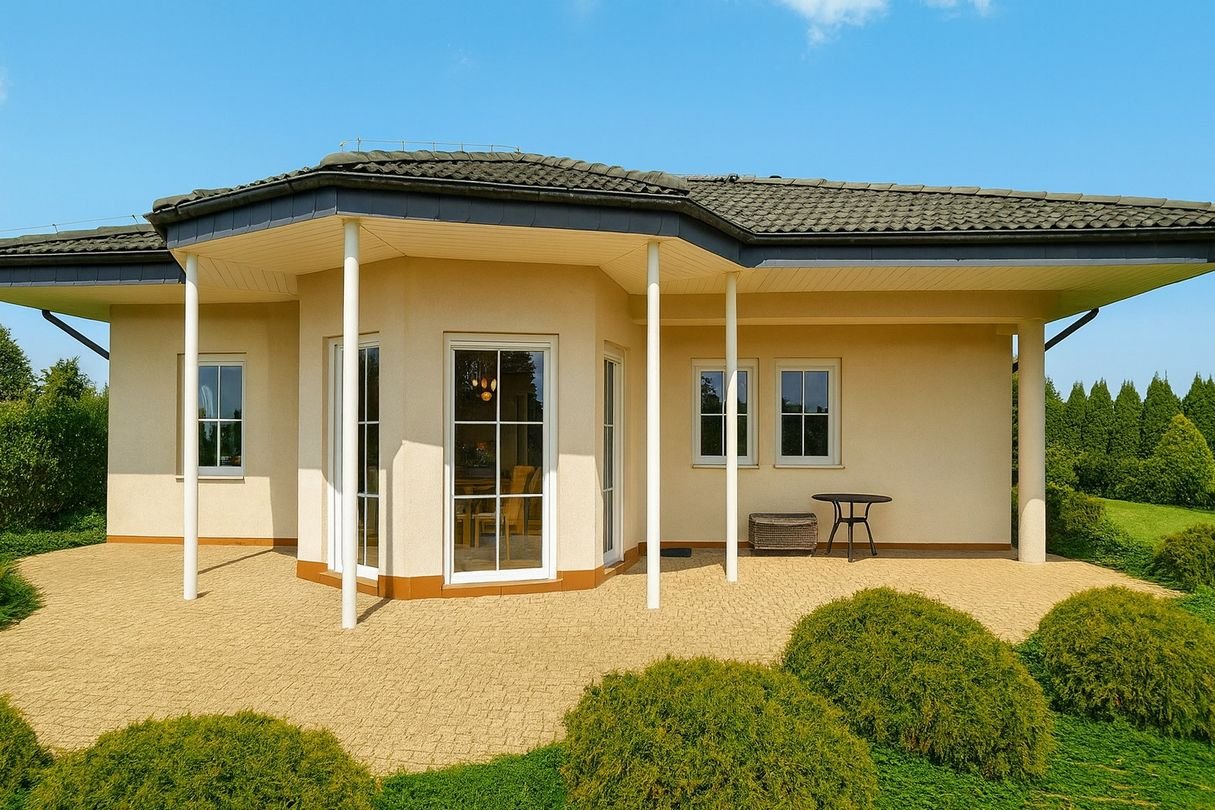 Wnętrze domu zaprojektowano z myślą o komforcie i funkcjonalności. Centralnym punktem jest przestronny salon z kominkiem z płaszczem wodnym i rozprowadzeniem ciepła, z bezpośrednim wyjściem na ogród. Kuchnia z jadalnią oraz spiżarnią wyposażona jest w zabudowę kuchenną i pełne AGD. Dom oferuje trzy komfortowe sypialnie, z czego jedna posiada wyjście na dodatkowy kameralny taras. Uzupełnieniem przestrzeni jest duży hol z czterodrzwiową zabudową oraz funkcjonalny wiatrołap.