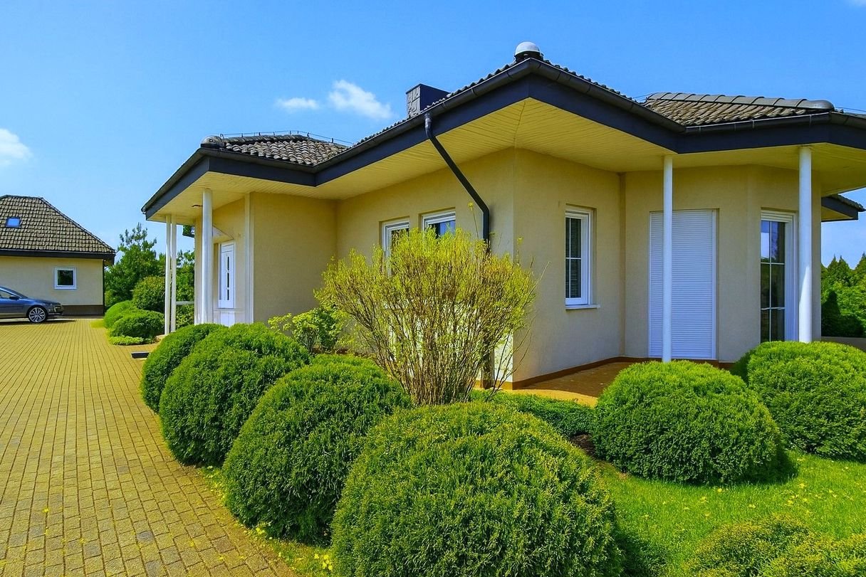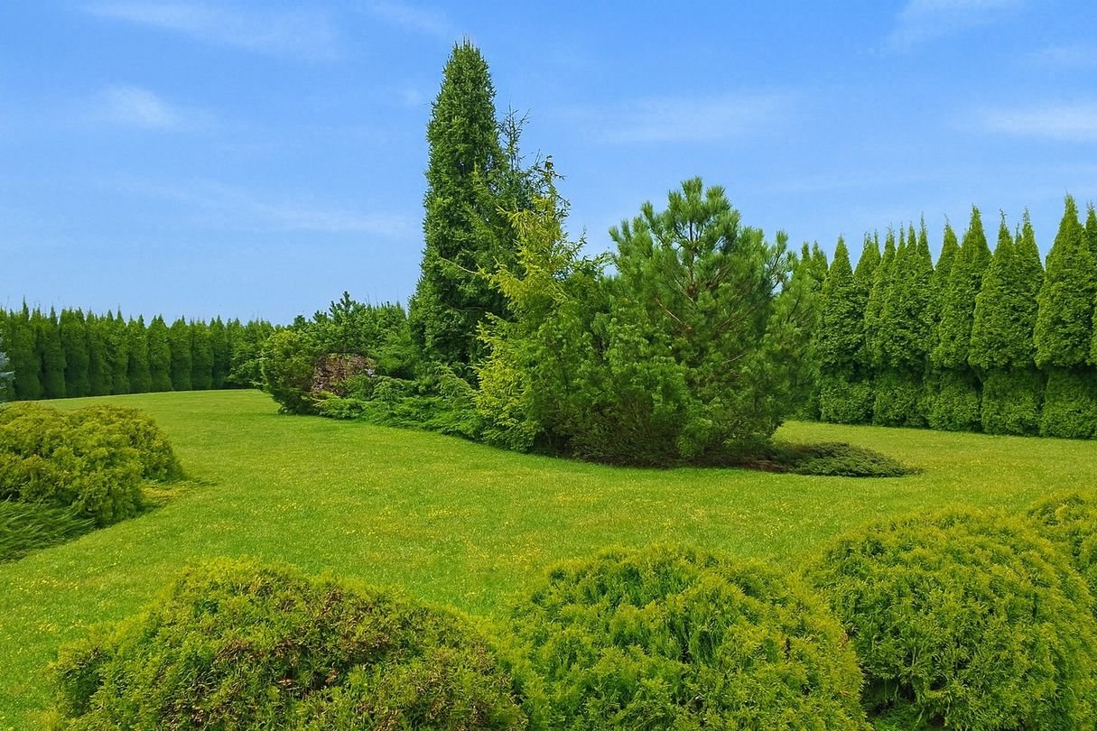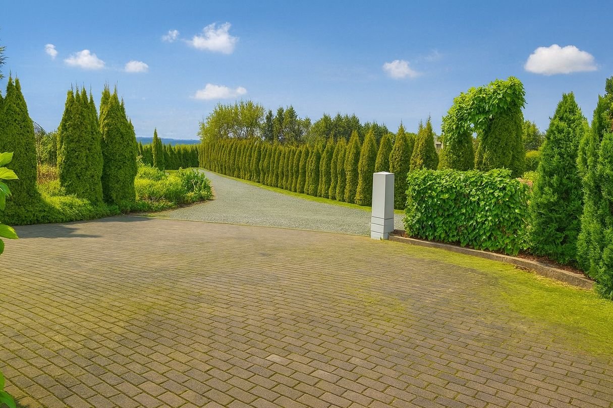 Działka została starannie zagospodarowana. Około 700 m² kostki brukowej zapewnia wygodny podjazd pod dom. Ogród zachwyca dojrzałą zielenią – liczne nasadzenia, około 200 tui, trawniki i krzewy ozdobne. Całość uzupełnia staw z pompą, z możliwością spuszczania wody grawitacyjnie oraz zasilania wodą z sieci. Ogród wyposażony jest w automatyczny system podlewania wykorzystujący wodę ze stawu.