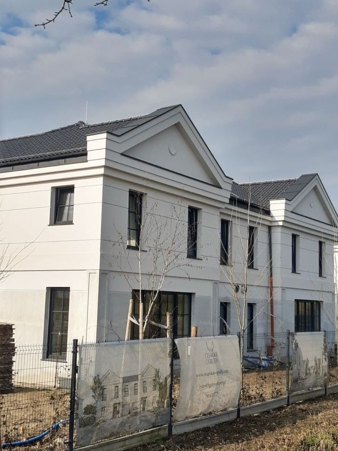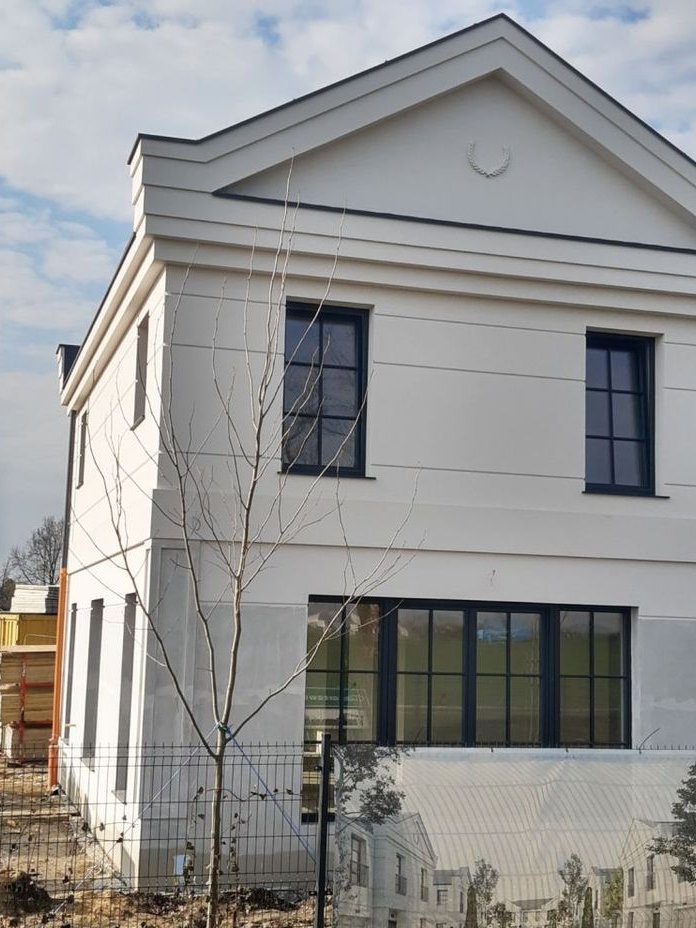 - elewacja - bogato zdobiona gzymsami, opaskami, tympanonami, boniami. Tynk strukturalny w kolorze jasno kremowym lub białym. Wokół budynków opaska żwirowa szerokości 50cm.